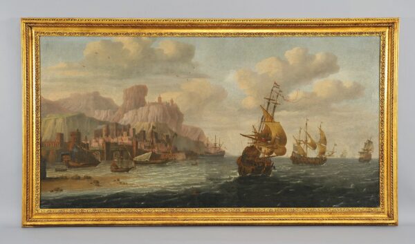 Jacob Van Der Cross (Olanda, circa 1635 1700) Veduta di porto mediterraneo con vascelli