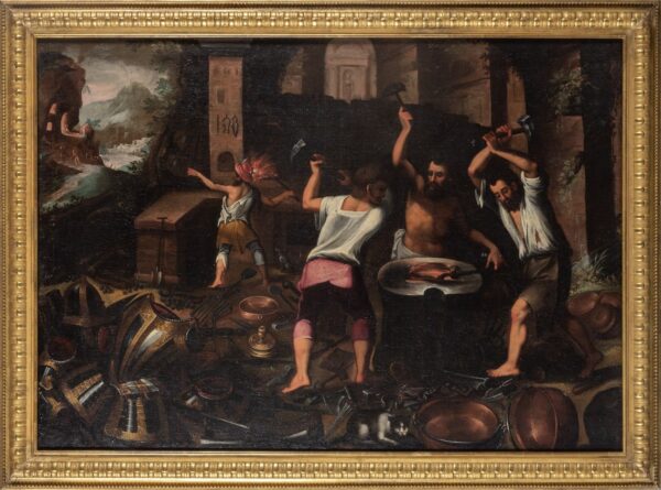 La fucina della armi, olio su tela, scuola bergamasca, secolo XVII