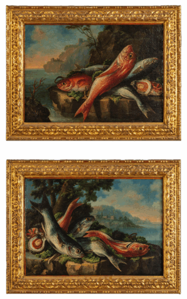 Nicola Maria Recco (attivo a Napoli fine XVII inizi XVIII secolo) Nature morte di Pesci con sfondo di Costiera Amalfitana, coppia di oli