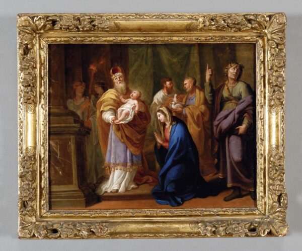 La presentazione al tempio, olio su rame racchiuso in cornice antica in legno intagliato e dorato, scuola francese secolo XVIII