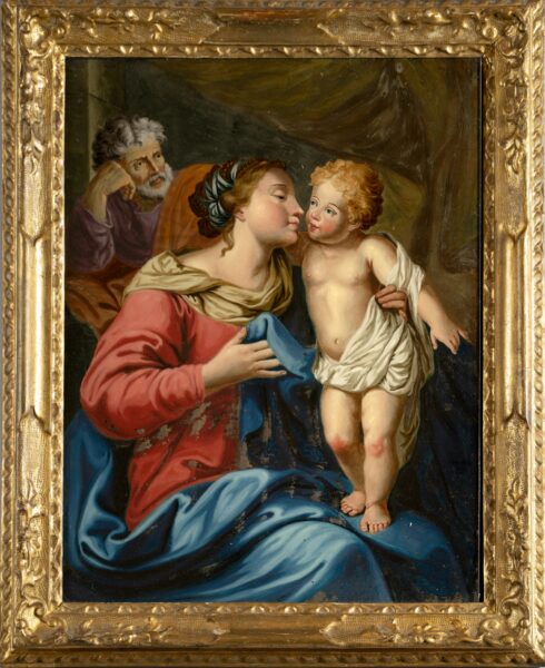 Sacra Famiglia, olio su vetro in cornice coeva in legno finemente intagliato e dorato, scuola veneta secolo XVIII