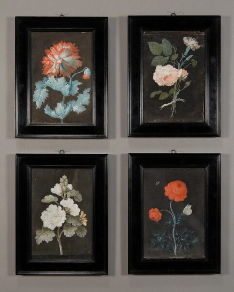 De Caro Baldassarre (Napoli 1689 1750) quattro minuti oli su tavola raffiguranti Vasi di fiori e animali da cortile