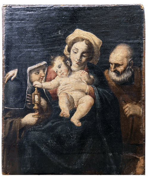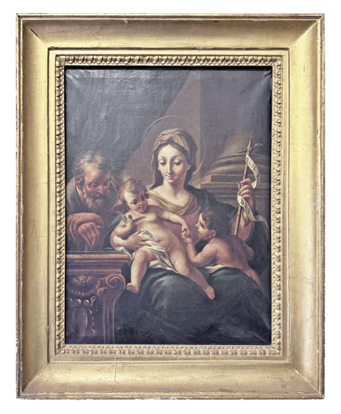 La Sacra Famiglia, scuola italiana secolo XVIII, olio su tela applicata su tavola