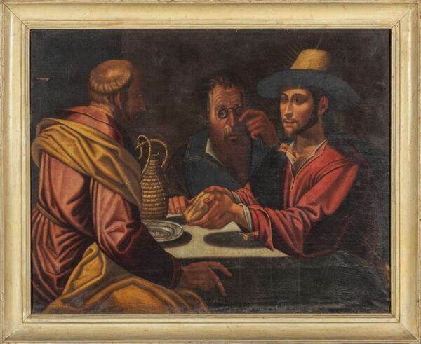 La divisione del pane, olio su tela in cornice in legno laccato, scuola bolognese secolo XVII