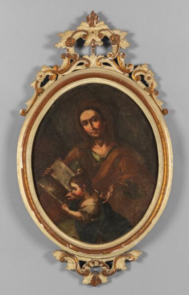 L’educazione della Vergine, olio di forma ovale con cornice in legno intagliato, dorato e laccato.