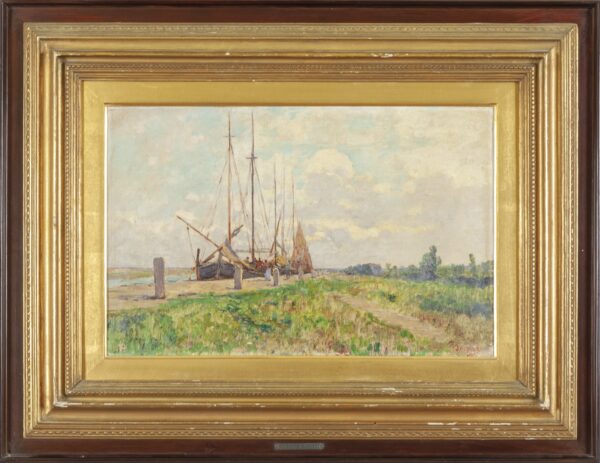 Giuseppe Sacheri (Genova 1863 Pianfei CN 1950) Barche lungo il canale in Olanda, olio firmato in basso a destra