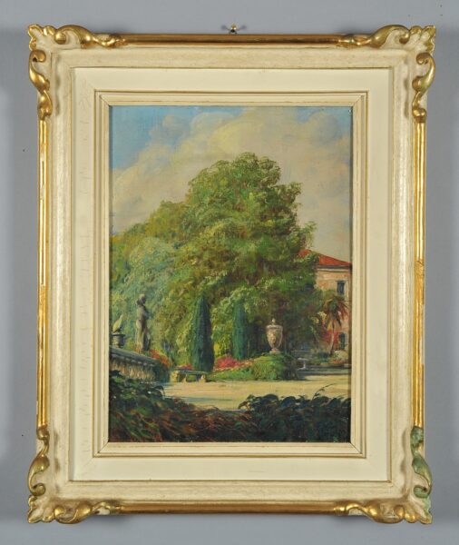 Berto Ferrari (Bogliasco GE 1887 Genova 1965) Nel parco di Villa Rossi (Cà Cornaro) a Bassano del Grappa, olio su tela applicata su cartoncino