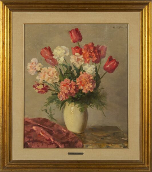 Antonio Schiaffino (Camogli GE 1879 Genova 1968) Garofani e tulipani, olio su tela firmato in basso a destra e datato ‘41