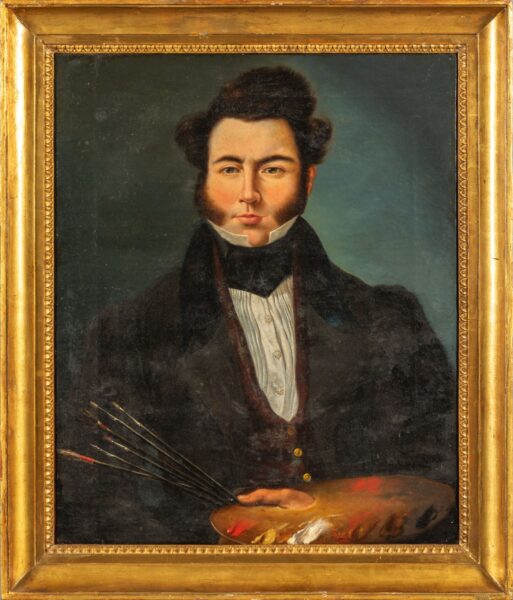 Ritratto del pittore Benedetto Musso, scuola italiana secolo XIX, olio su tela, cornice in legno intagliato e dorato coeva