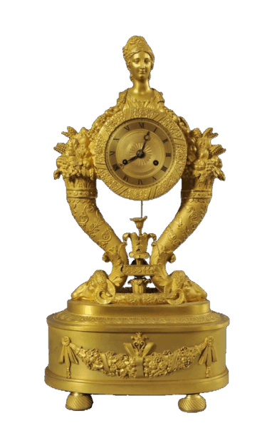 Orologio in bronzo dorato retto da una Coppia di cornucopie e sormontato dal mezzobusto di una fanciulla, Francia periodo del Carlo X, circa 1820 1830