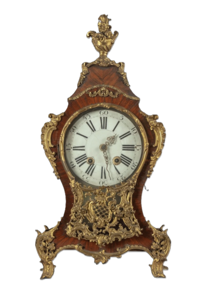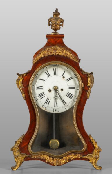 Orologio a Cartel Luigi XV lastronato in legno di rosa con ricca applicazione di bronzi dorati, Francia secolo XVIII