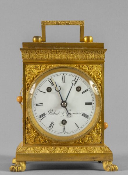 Pendola da carrozza in bronzo dorato con ripetizione, firmata Robert, Francia I metà secolo XIX