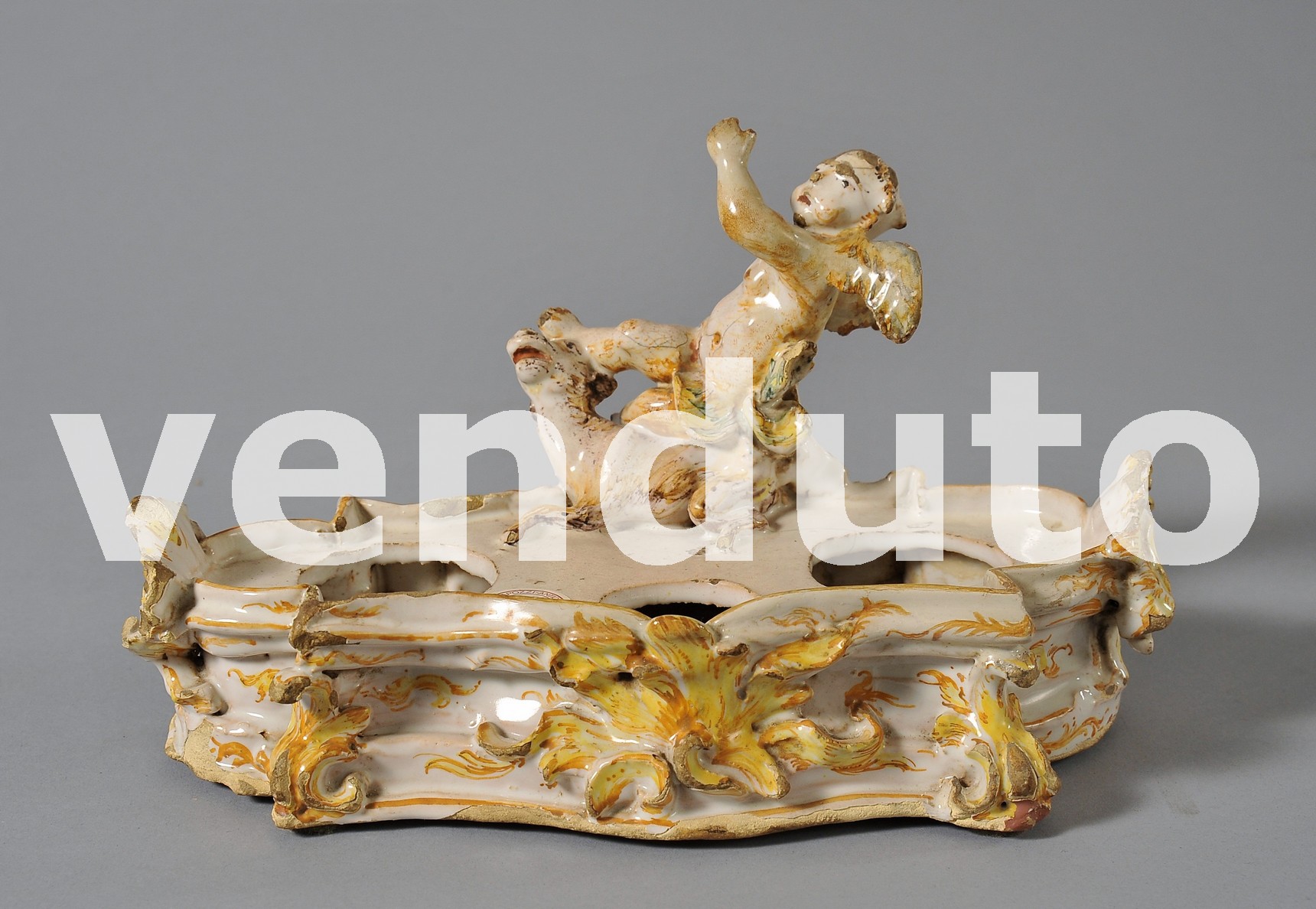 Elegante calamaio barocchetto in maiolica, realizzato nella metà del XVIII secolo a Savona. Questo pezzo è modellato a forma di piccola fontana, con un angelo in rilievo che interagisce con un cane, entrambi arricchiti da decorazioni floreali dorate. La maiolica, finemente lavorata, presenta colori delicati e luminosi, con sfumature di giallo e oro che esaltano la bellezza e la raffinatezza dell’oggetto. Il calamaio non solo rappresenta una funzionalità nell’uso quotidiano ma diventa un simbolo di lusso e prestigio per le nobili famiglie che lo utilizzavano.