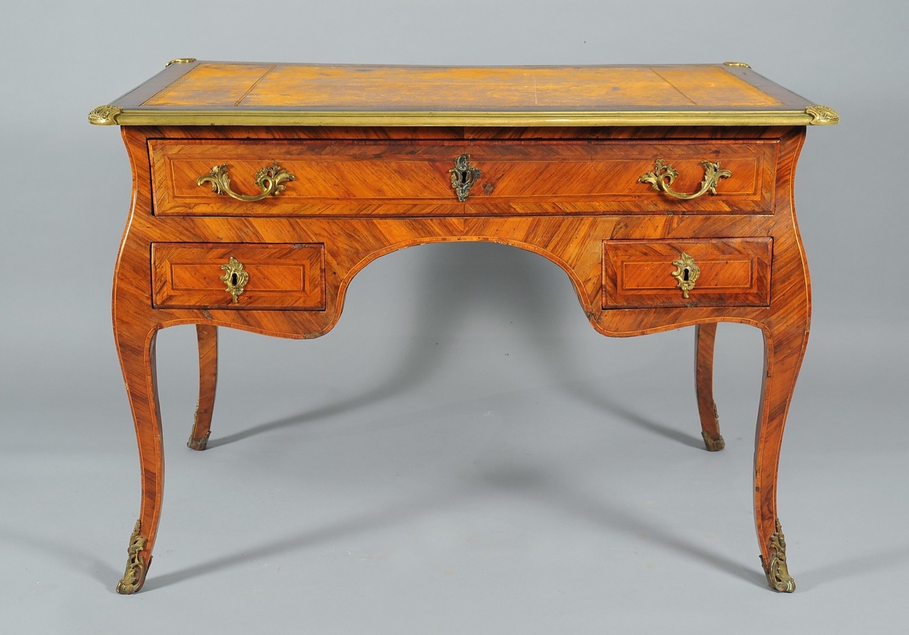 Elegante scrivania Luigi XV finemente lastronata in legno di rosa e impreziosita da filettature in legni di frutto, Sicilia metà del XVIII secolo