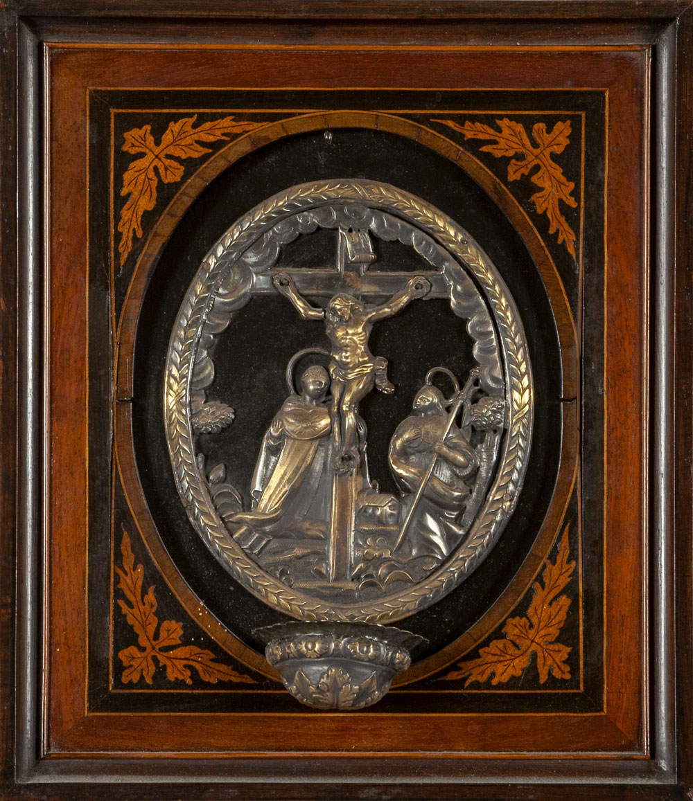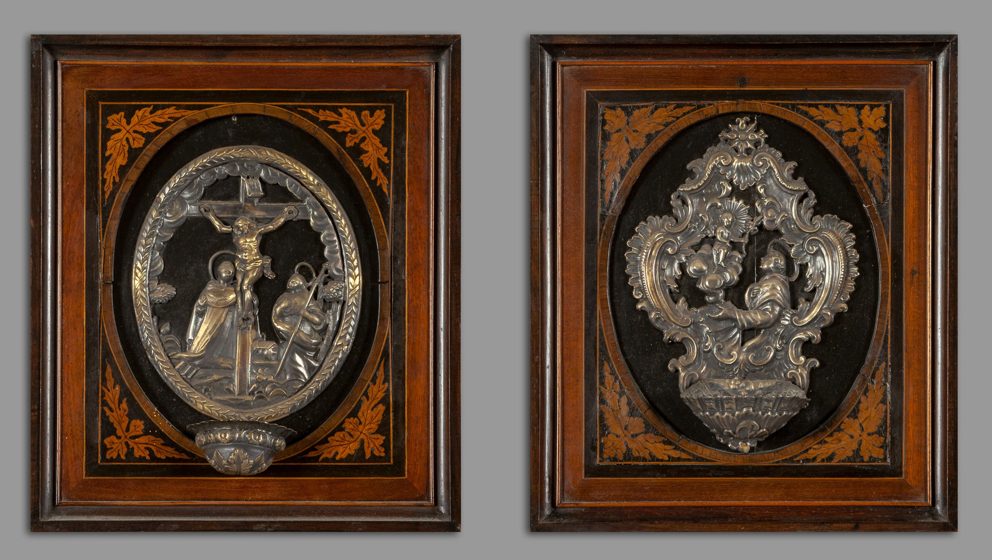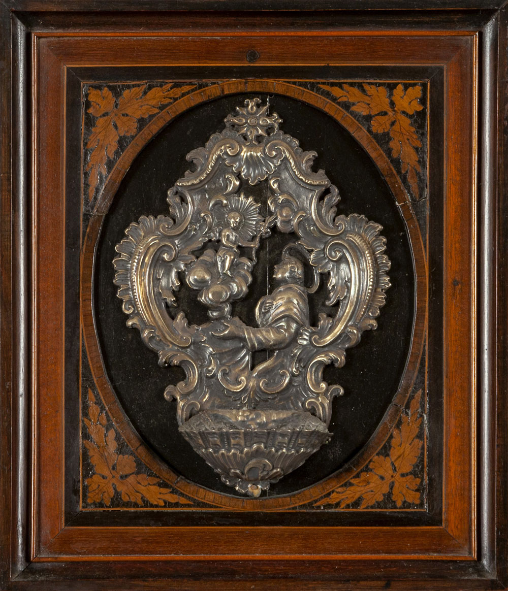 Realizzate nel secolo XVIII, queste acquasantiere sono caratterizzate da una lavorazione fine che combina tecnica e spiritualità, con il dettaglio sbalzato delle figure sacre che riflette lo stile Luigi XV. Una delle acquasantiere è contraddistinta dal punzone della Torretta, risalente all’anno 1759. Le cornici in legno, finemente lastronate e intarsiate, ne esaltano la bellezza, conferendo un ulteriore elemento di eleganza e prestigio.
