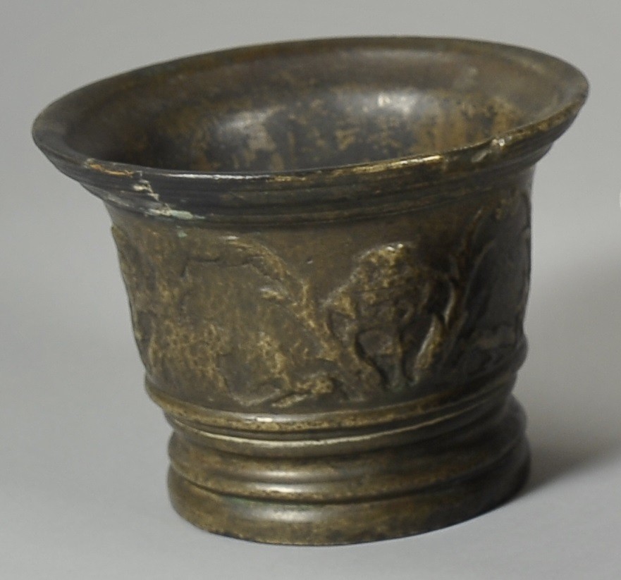 Antico mortaio in bronzo a patina chiara con scene di caccia