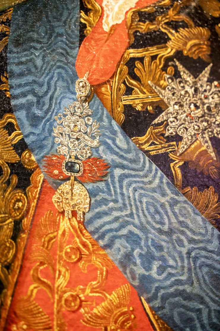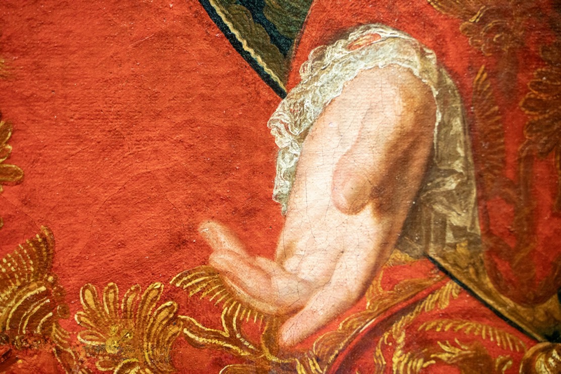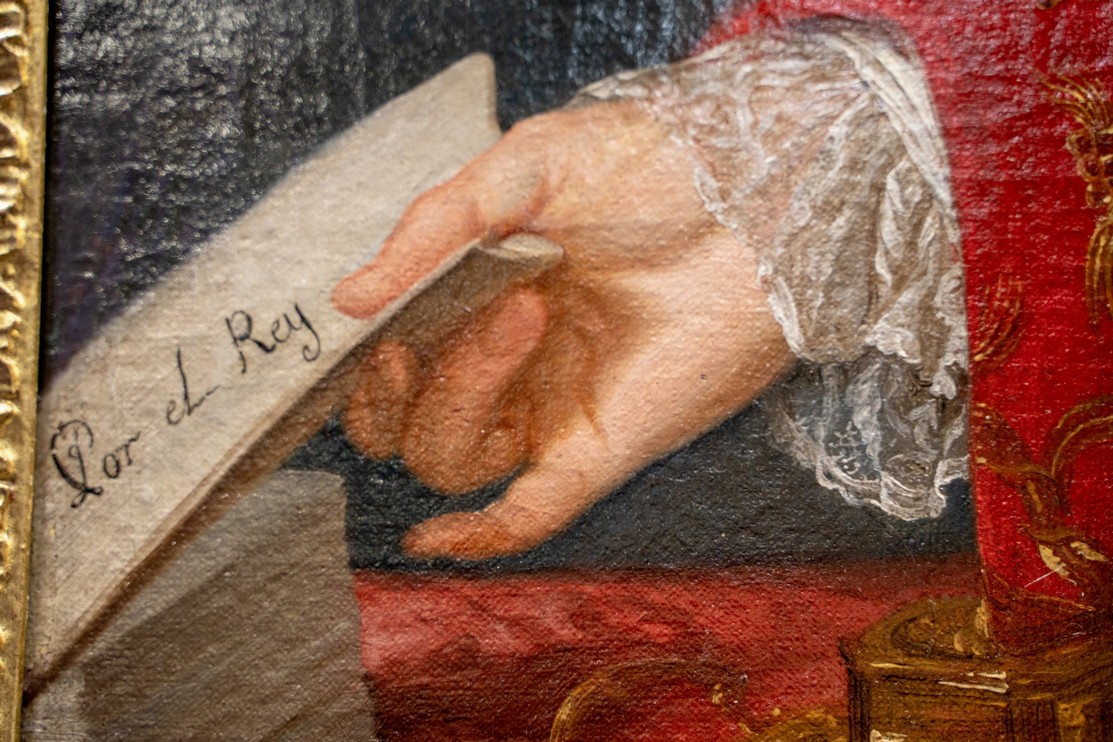 L’uso della luce nelle pieghe dei tessuti e nei dettagli come le mani e il volto di Grimaldi conferisce profondità e tridimensionalità, rendendo l’immagine vibrante di realismo. La sua espressione, carica di dignità e consapevolezza, evoca l’impegno diplomatico e la serietà del momento storico che stava vivendo. Inoltre, l’accurata rappresentazione delle vesti, così come i dettagli dei gioielli e delle decorazioni, riflettono l’alta classe sociale del soggetto e l’importanza dell’evento politico in corso.