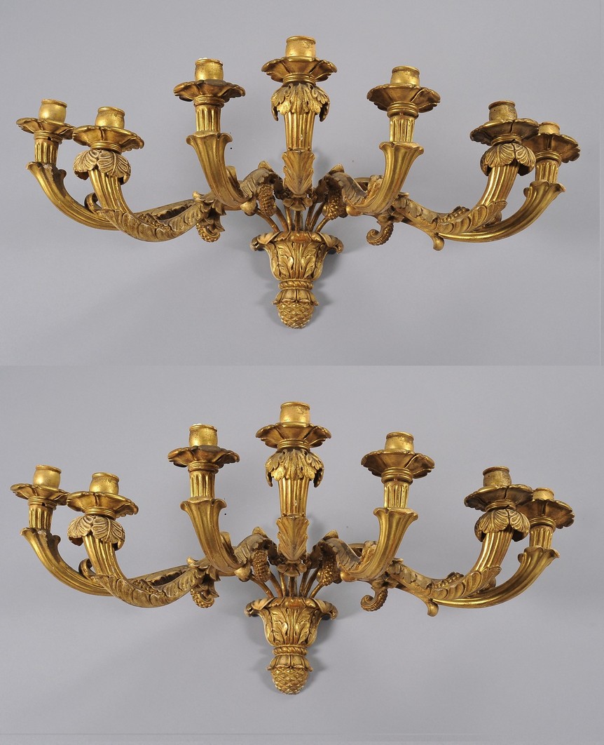 Coppia di importanti applique a sette bracci in legno finemente intagliato e dorato, Roma secolo XVIII