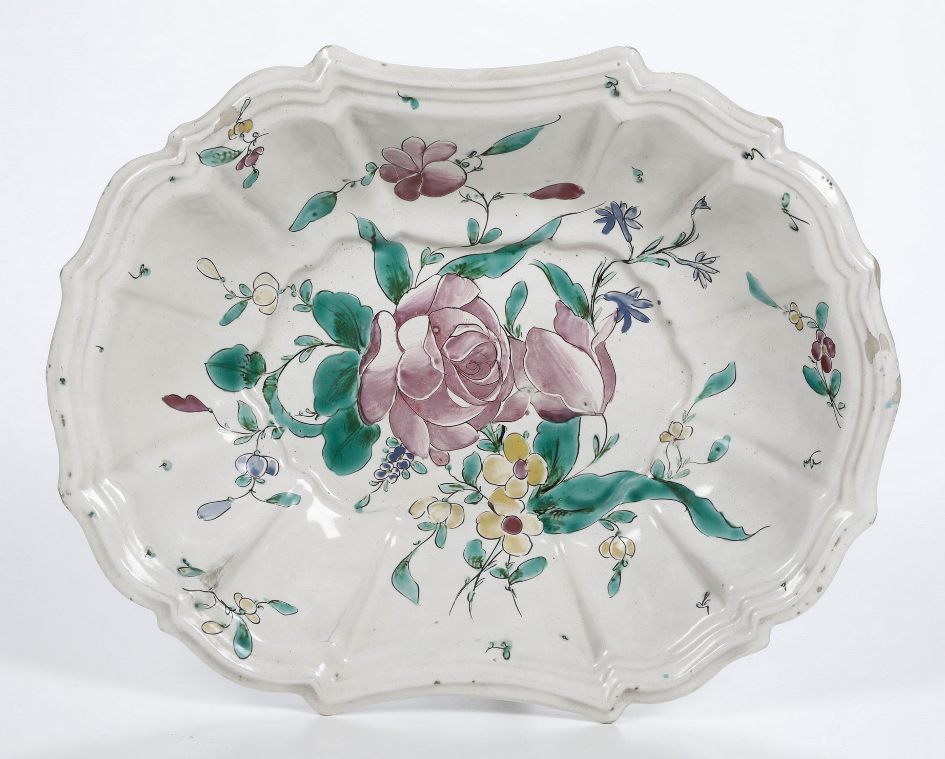 Il bacile dal bordo mistilineo e parete mossa è decorato con una rosa, un tulipano e fiori minori in policromia a piccolo fuoco “alla maniera di Strasburgo”: contorni tracciati velocemente disegnano la composizione di foglie e fiori dipinti con rapidi tocchi di pennello.