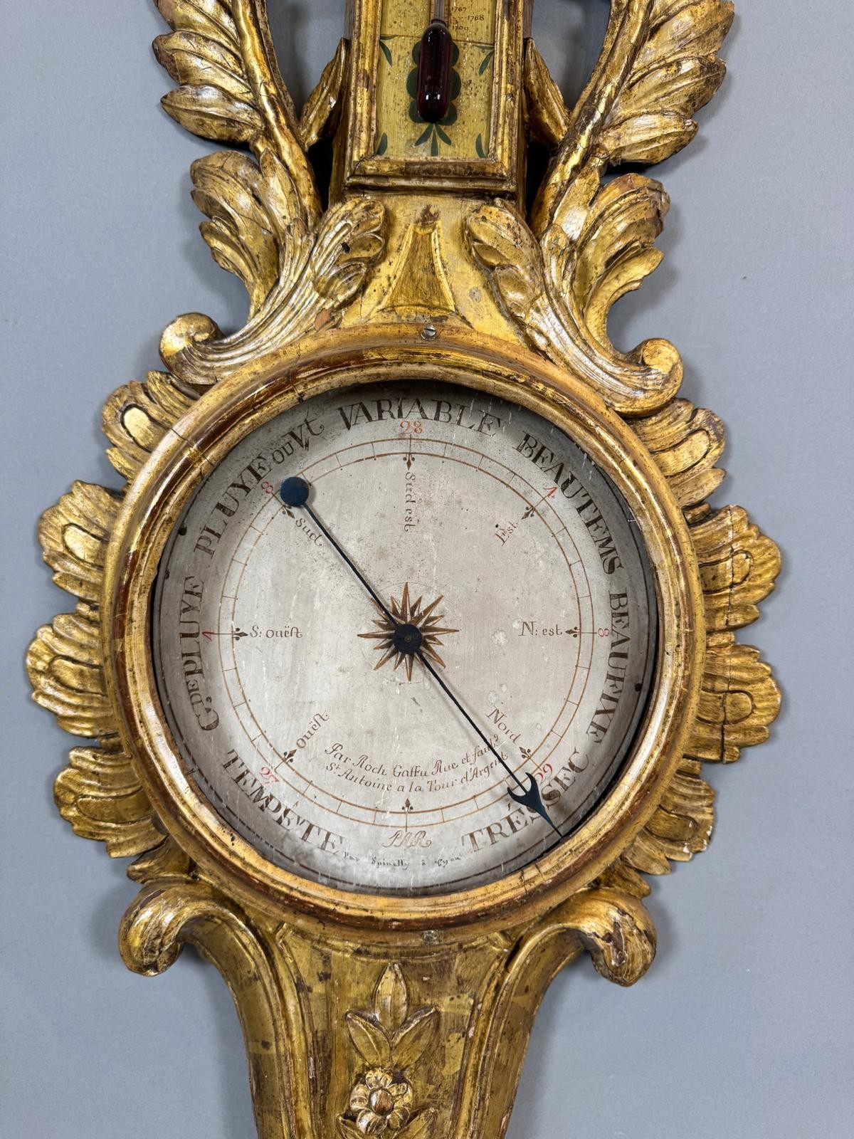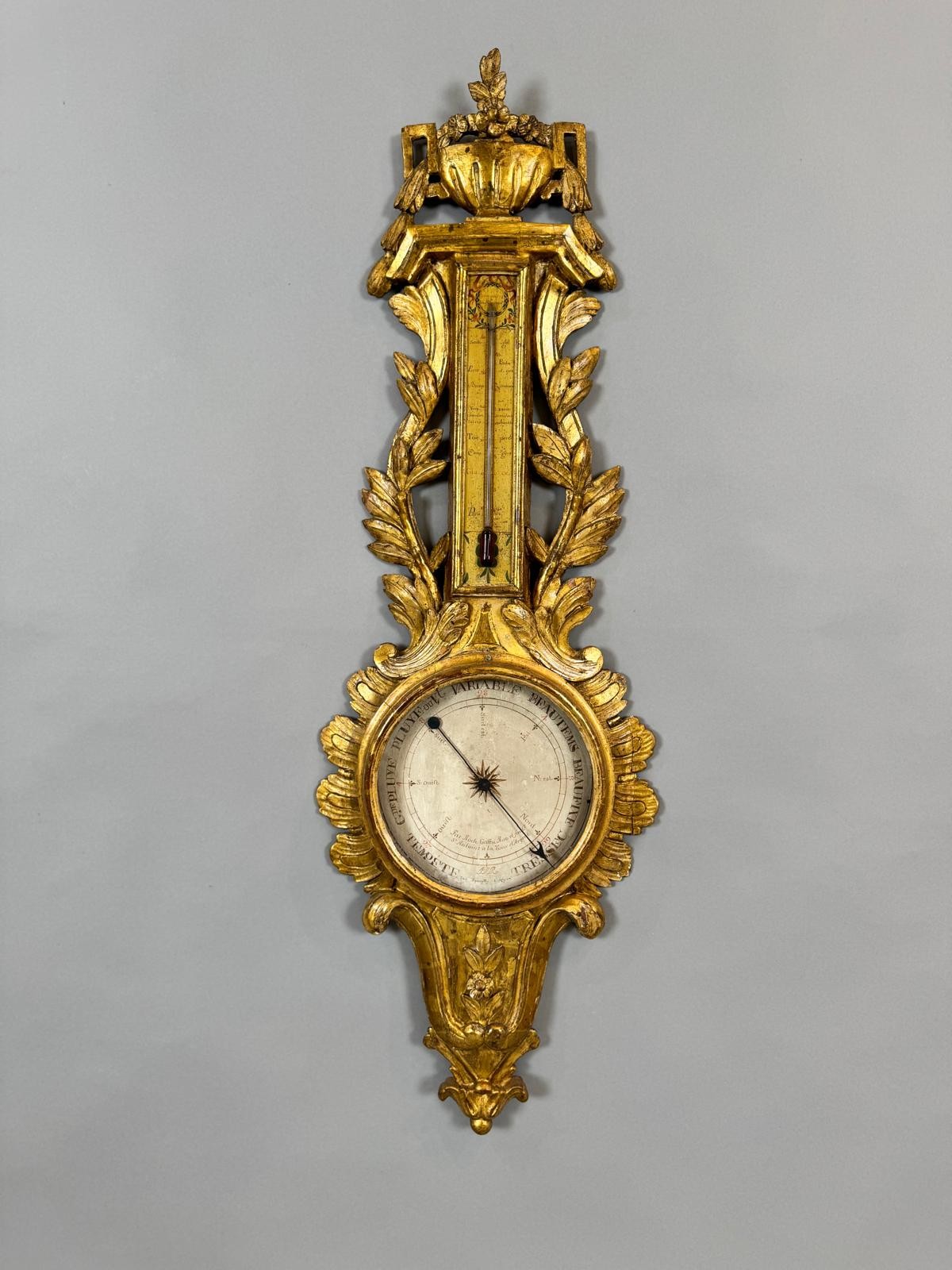 L’opera è impreziosita da un termometro integrato e sormontata da un vaso decorato con cascate di fiori, elemento distintivo del gusto neoclassico