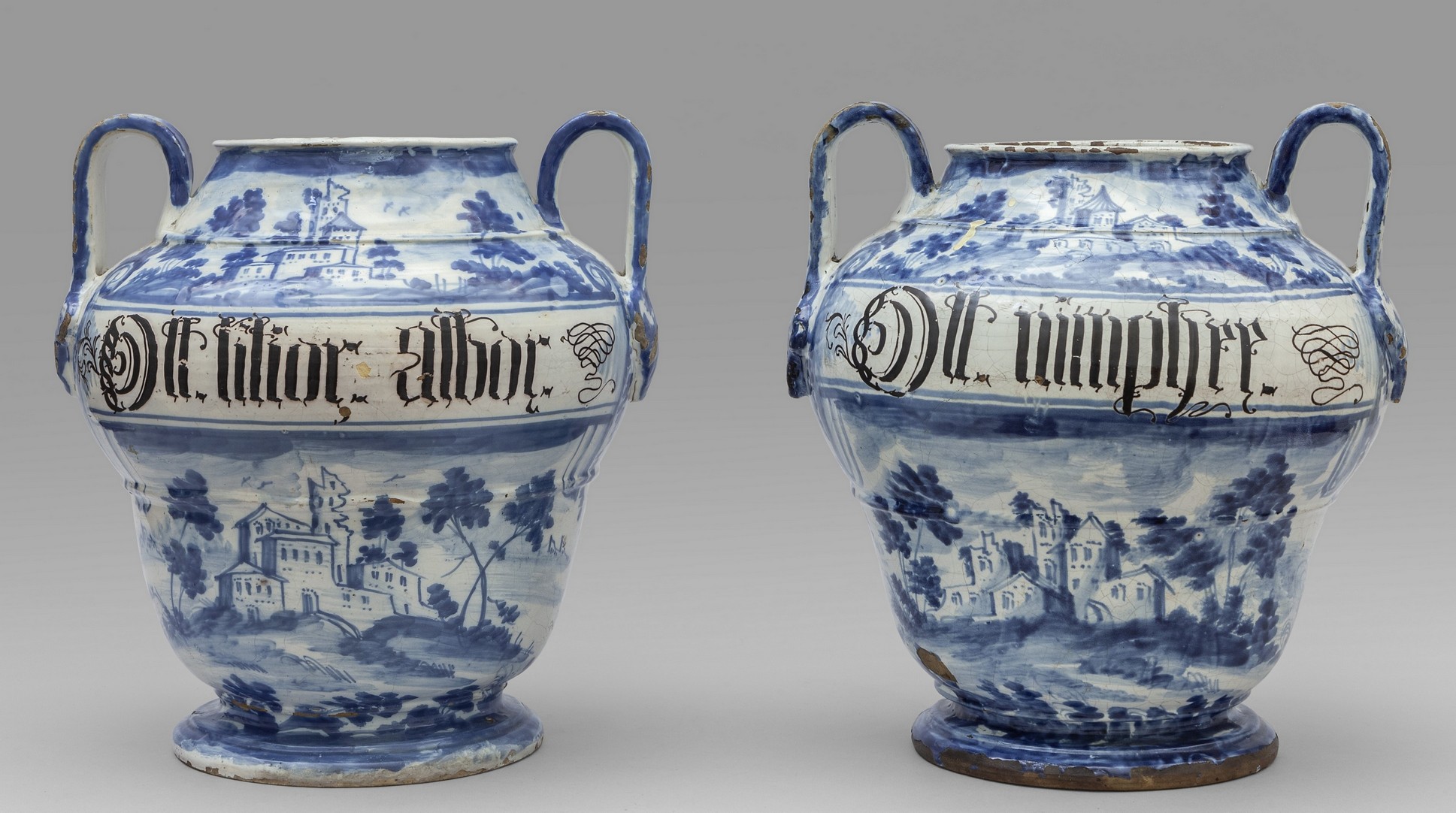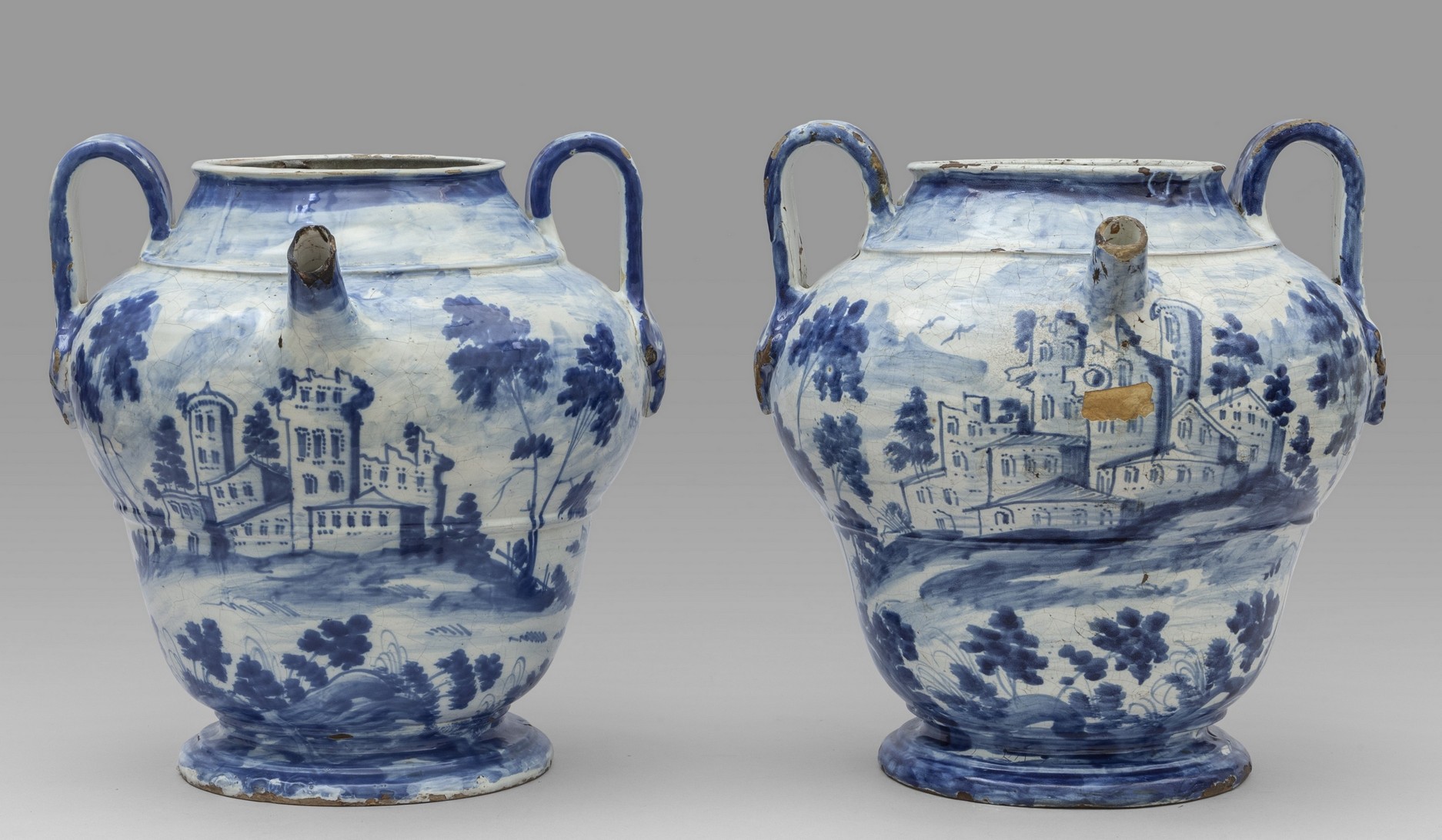 Coppia di grandi boccioni versatoi in decorata in ceramica blu su fondo bianco, Italia Centrale fine secolo XVII
