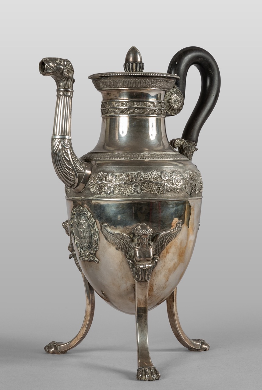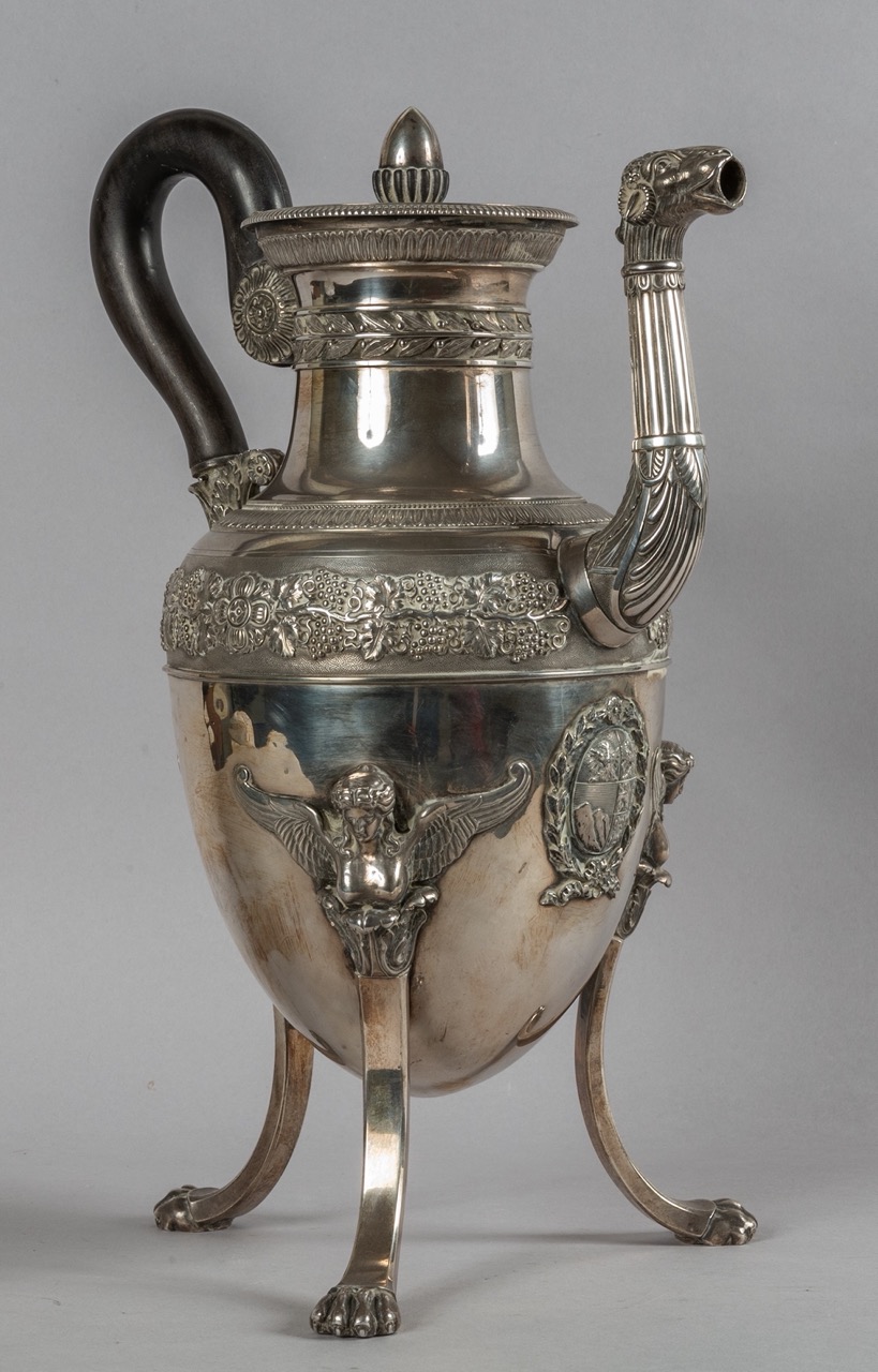 Grande caffettiera Carlo X in argento finemente sbalzato, Francia secolo XIX