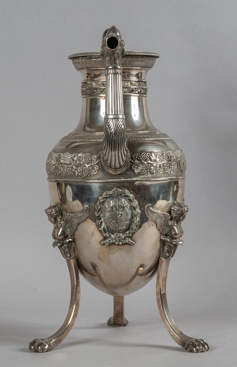 Corpo centrale sostenuto da tre piedi protomorfi con testine di angeli, stemma centrale nobiliare con decorazioni a motivi vegetali, beccuccio con testa di caprone, manico in legno ebanizzato.