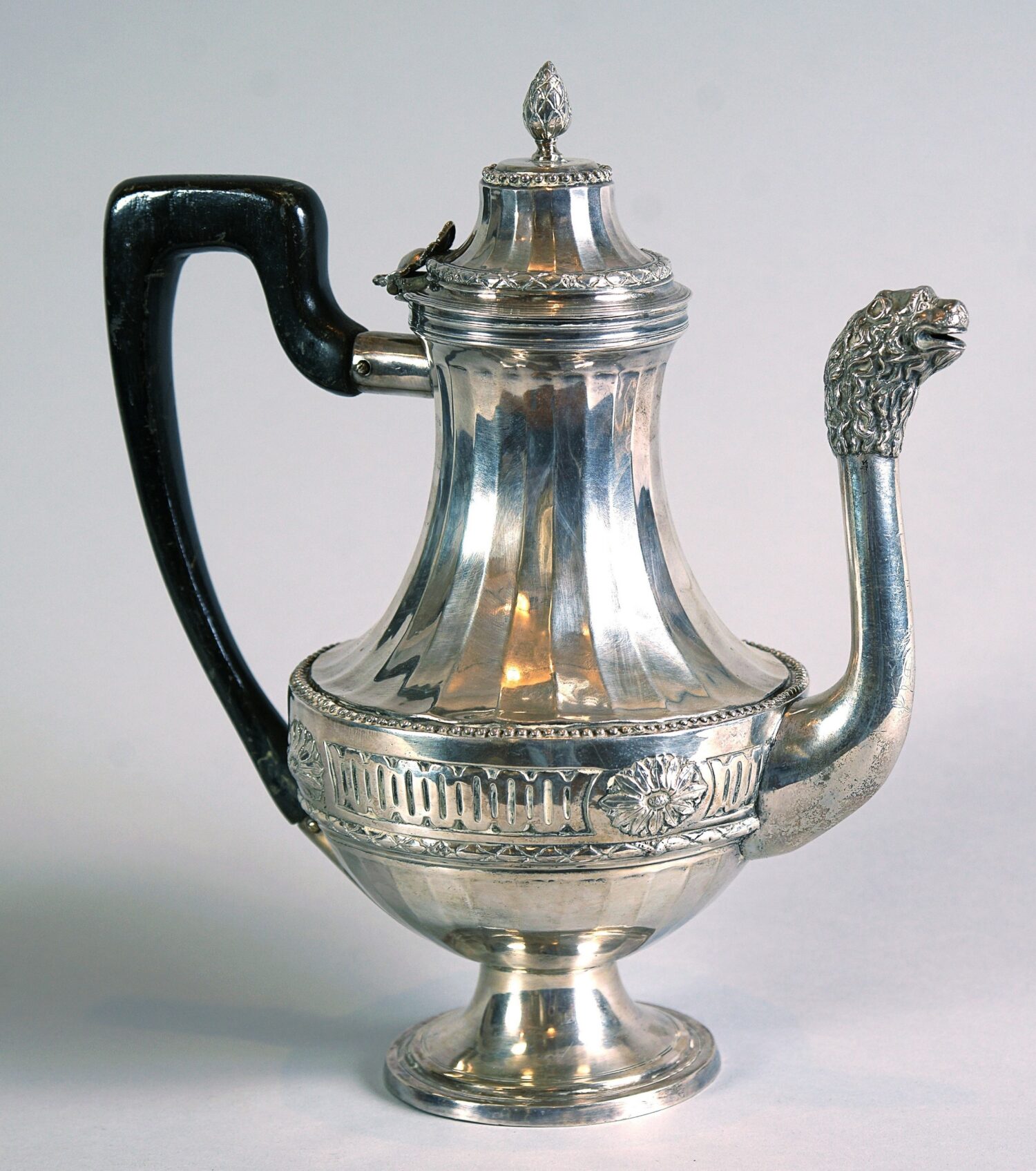Corpo costolato attraversato da fascia centrale sbalzata a motivi neoclassici; versatoio a forma di testa leonina