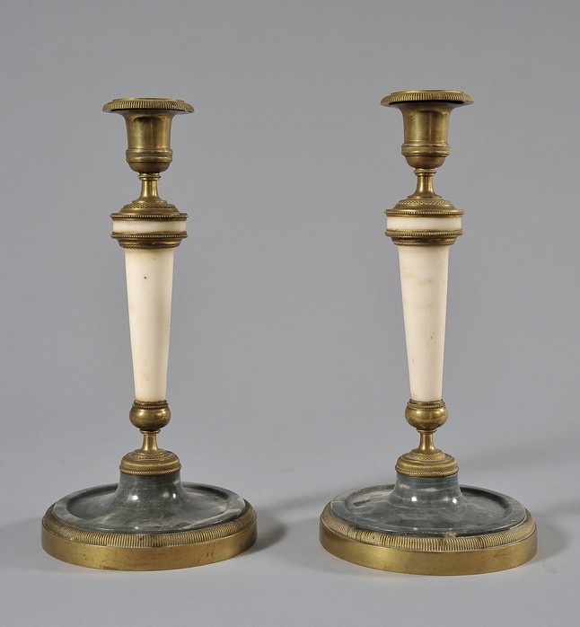 Coppia di Candelieri Luigi XVI in bronzo con applicazioni di marmo bianco e marmo bardiglio, Piemonte fine secolo XVIII