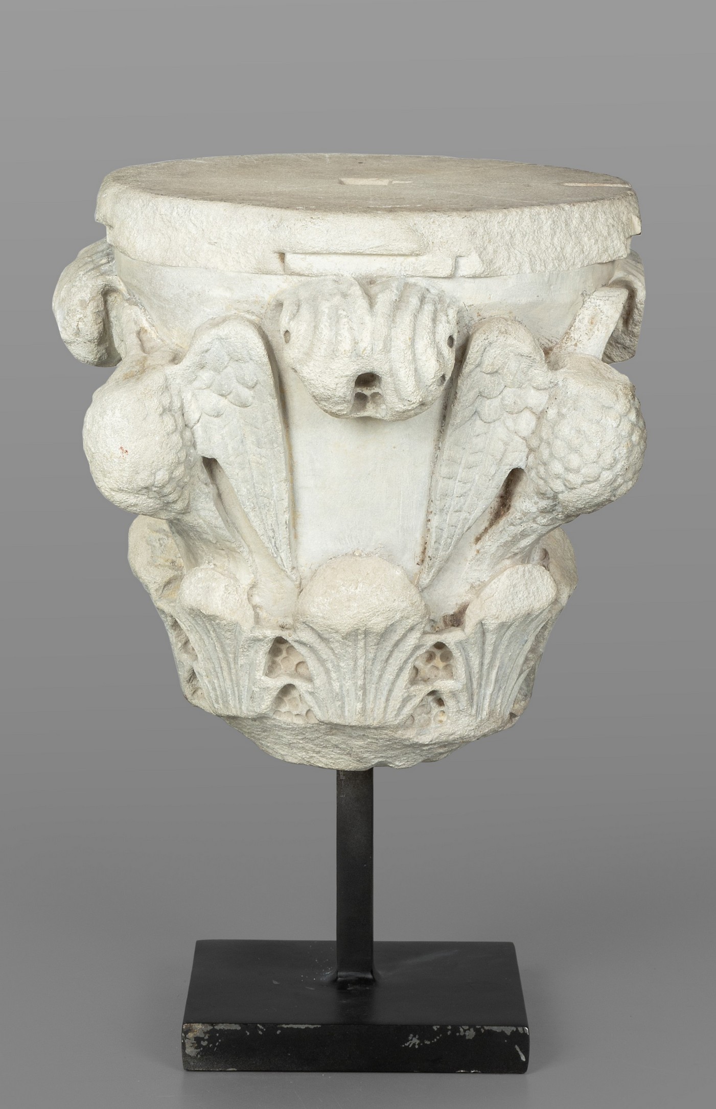 Capitello medievale di epoca federiciana in pietra scolpita con aquile e foglie, Italia centrale secolo XIII