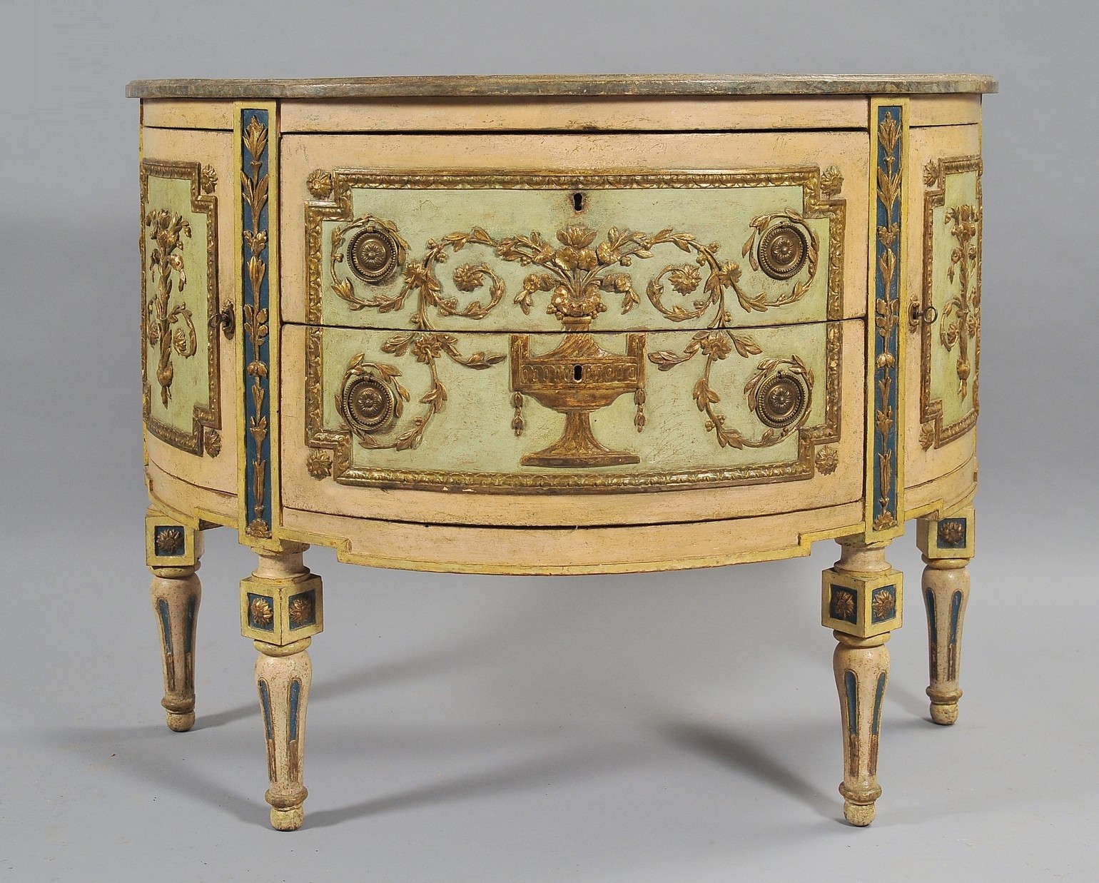 Giuseppe Maria Bonzanigo (Asti 1735 Torino 1820), scultore della casa reale. Cassettone a mezzaluna di elegantissima linea, stupendamente intagliato con ornati a fogliami e vaso centrale decorati a foglia d oro su fondi laccati, parte in verde pallido e parte in blu e crema, piano in legno laccato a finto bardiglio.
