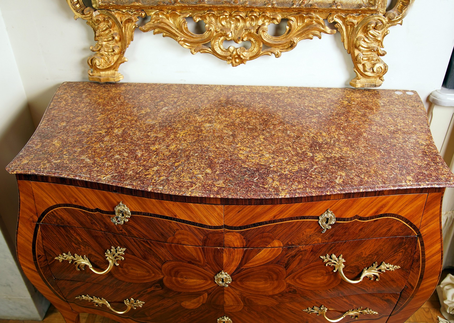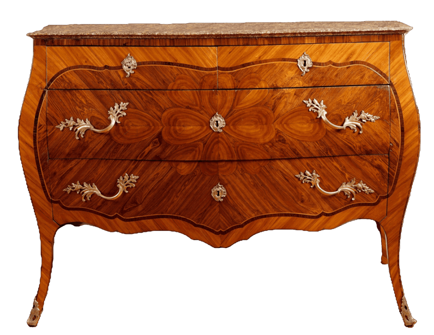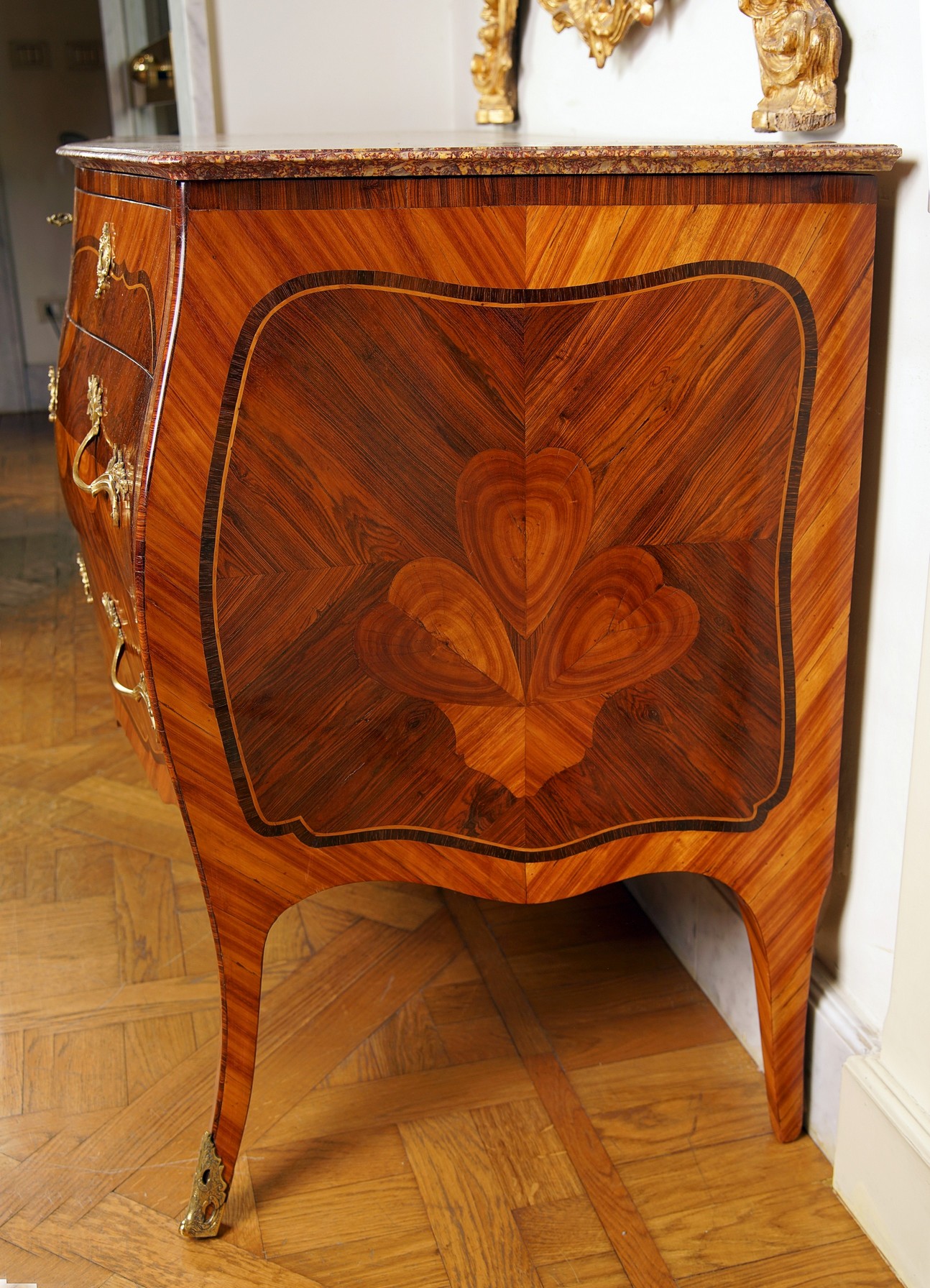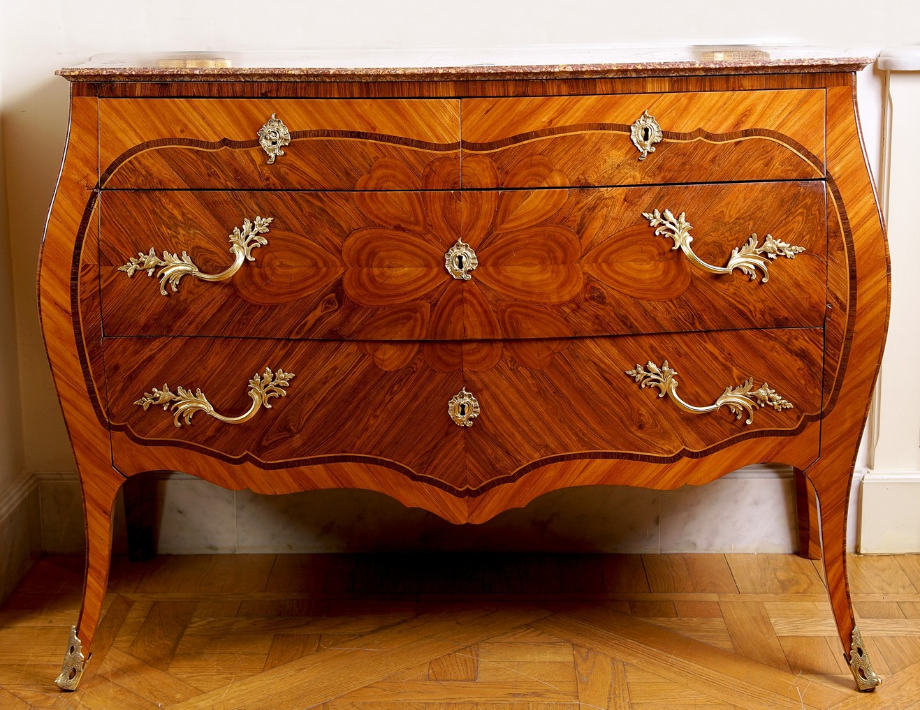 Di forma mossa a due cassetti più due cassettini, lastronato in legni esotici e intarsiato in legno di rosa con il caratteristico motivo del Cuore, piano in marmo Broccatello di Spagna, bronzi originali dorati al mercurio.