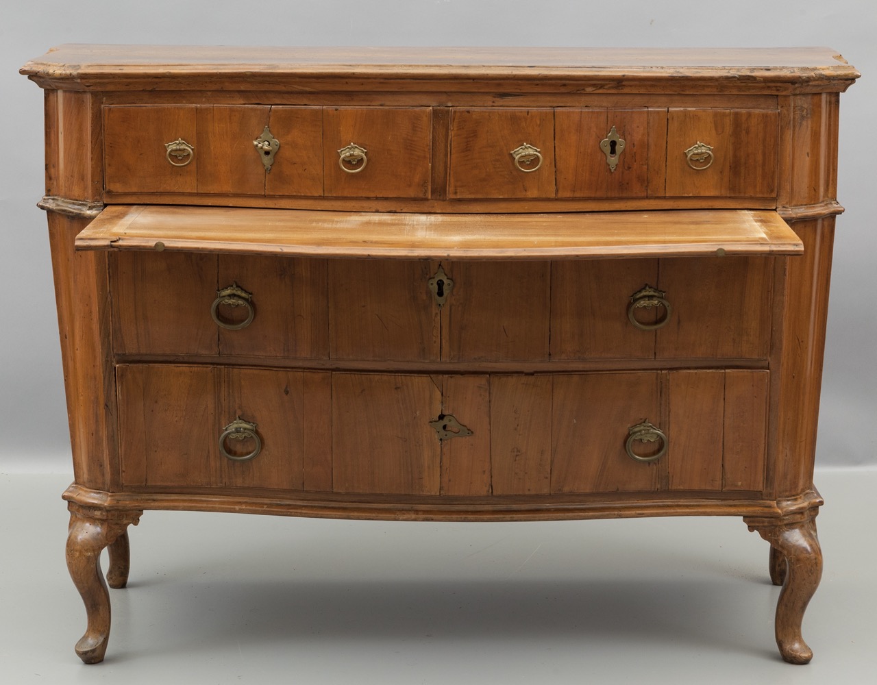 Presenta due piccoli cassetti nella fascia superiore e due ampi cassetti sottostanti. Il piano cela una tavoletta scrittoio estraibile.