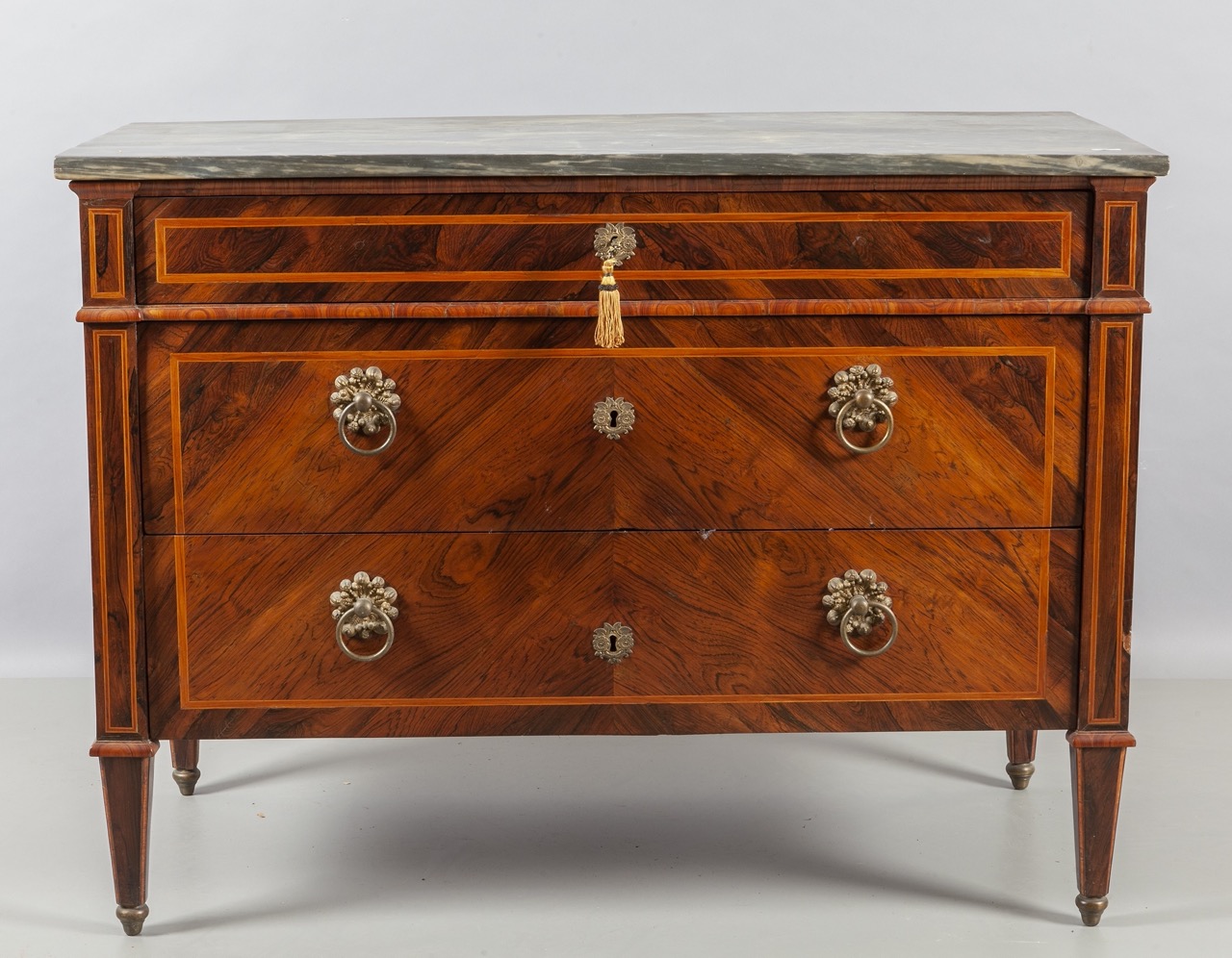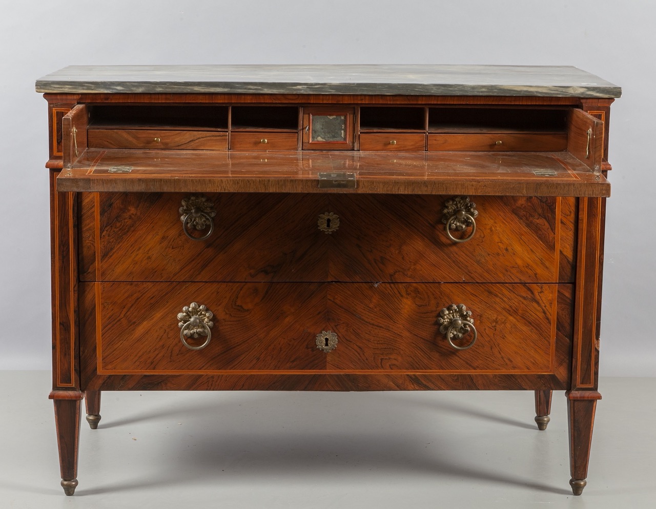 Lastronato in palissandro e filettato in bois de rose, piano in marmo bardiglio.