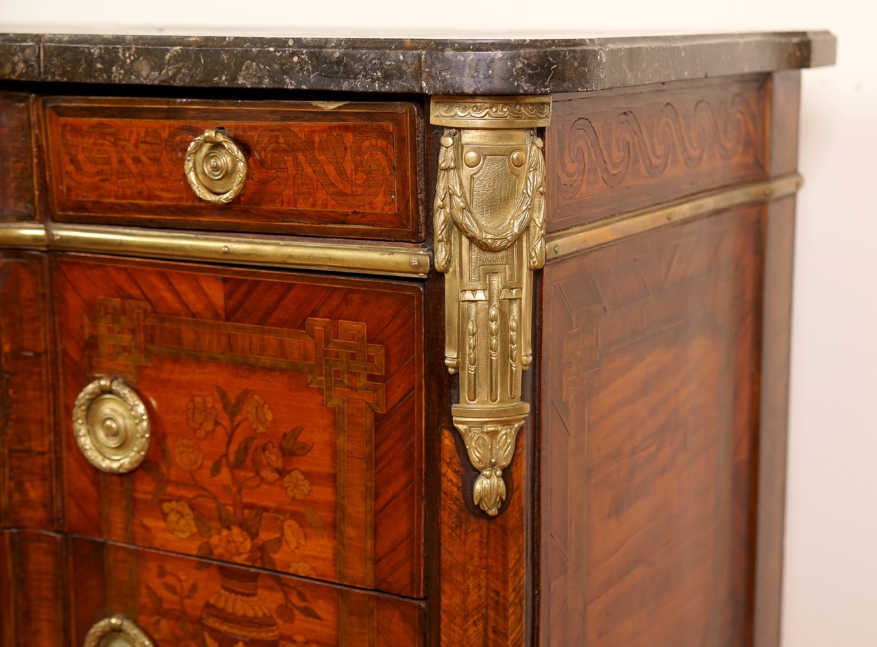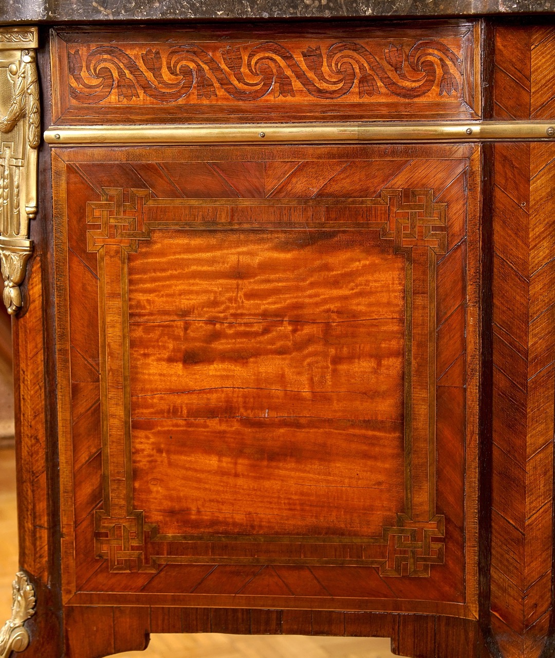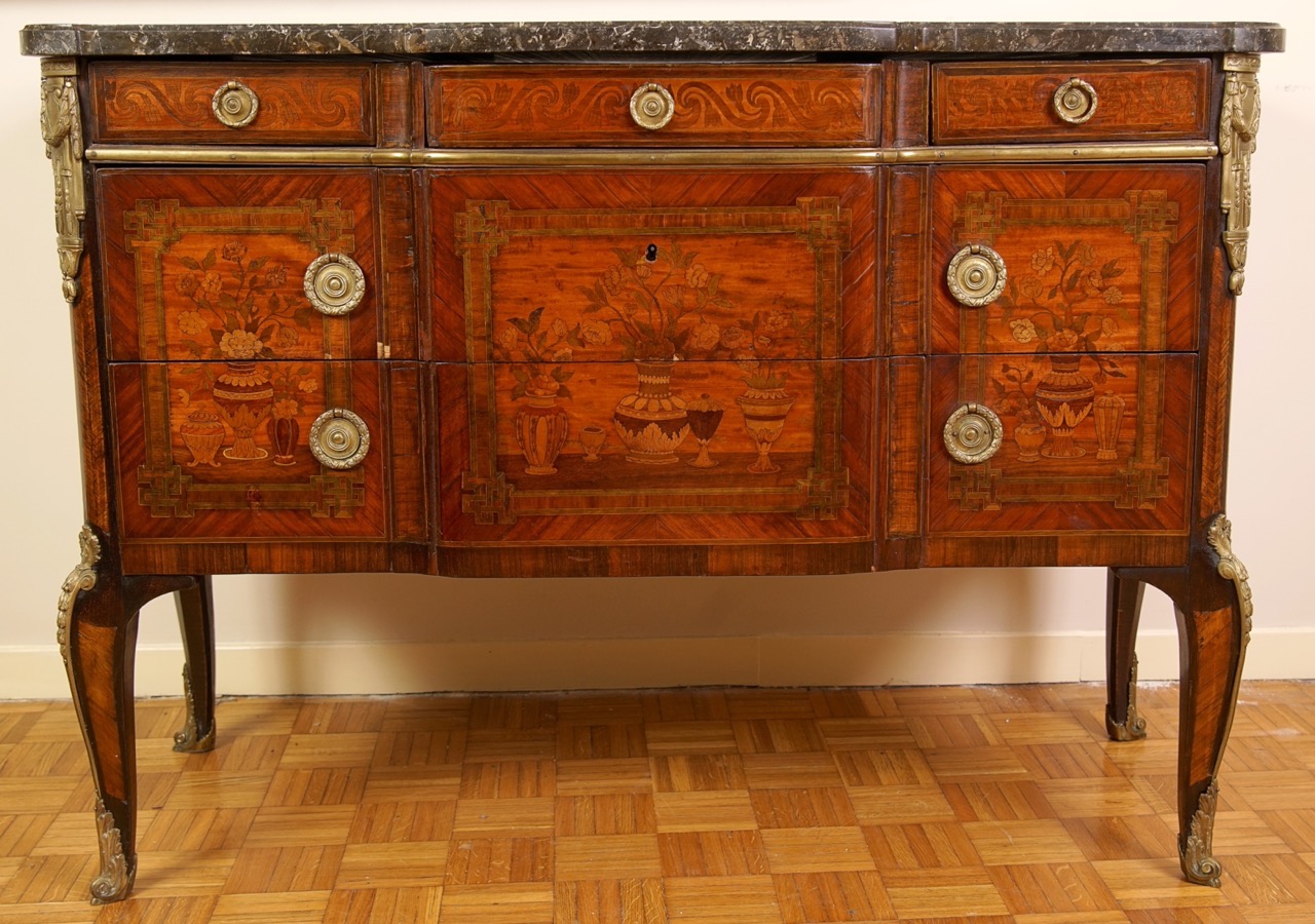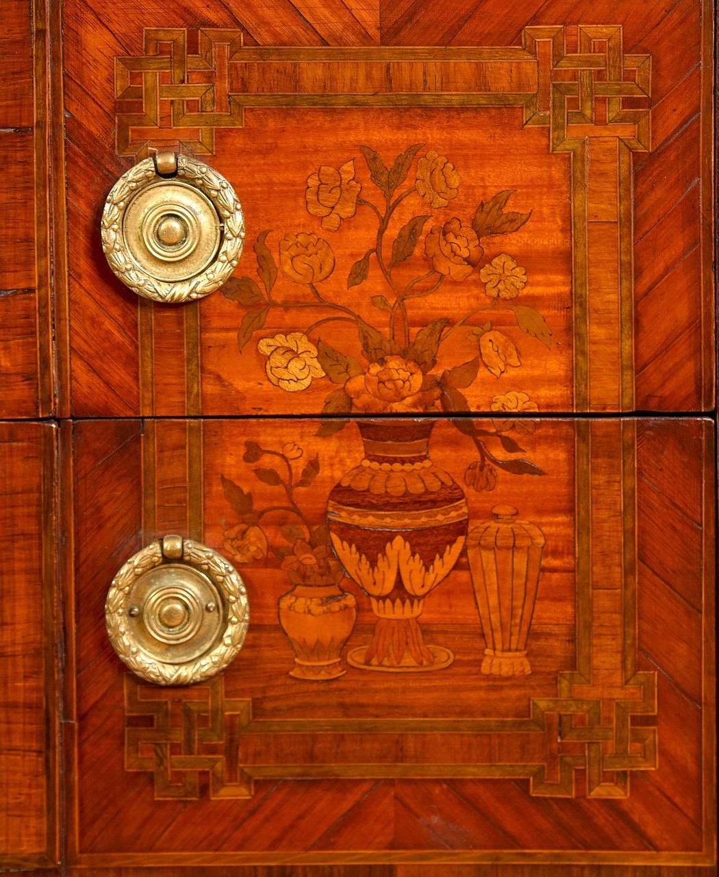 Finemente intarsiato a motivo di vasi di ispirazione orientale, ricca applicazione in bronzo, piano in marmo.