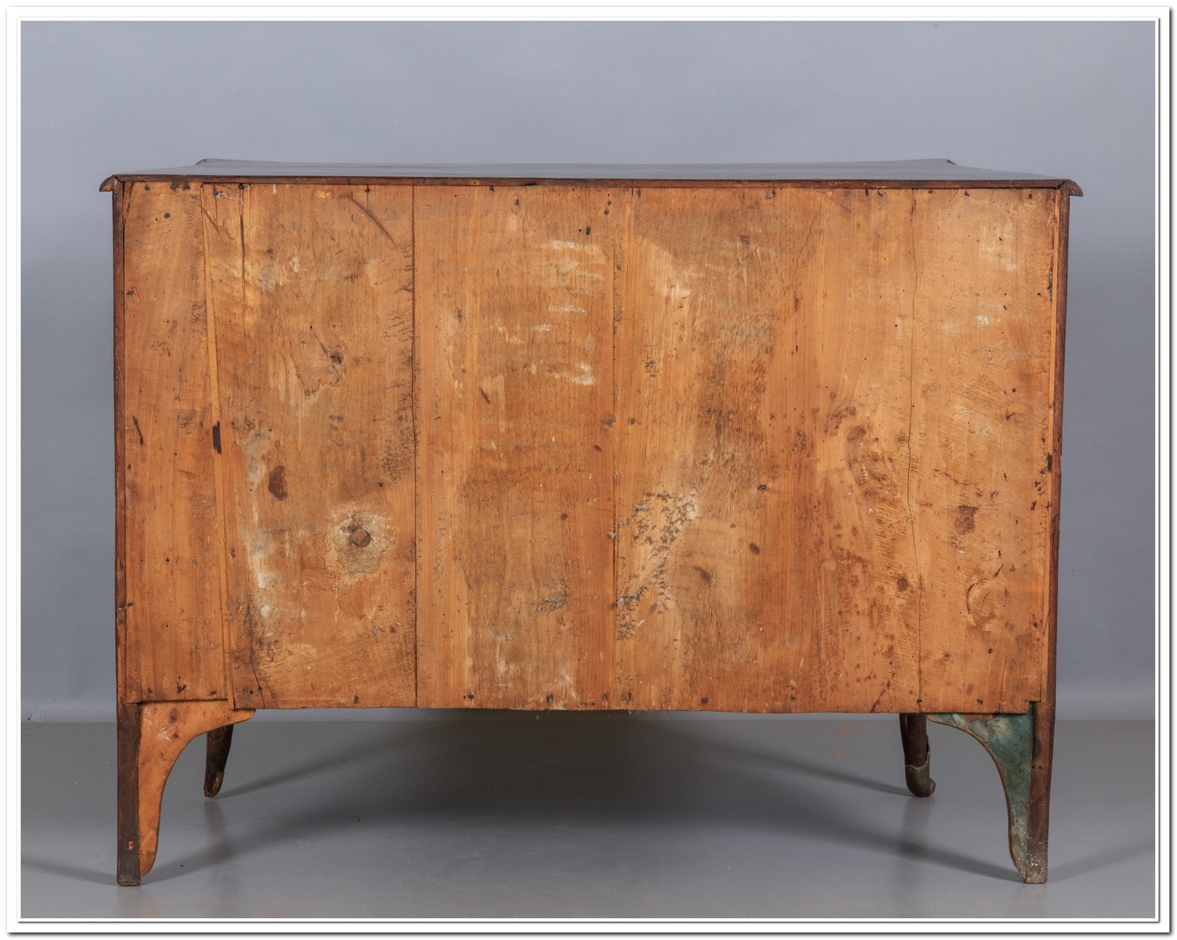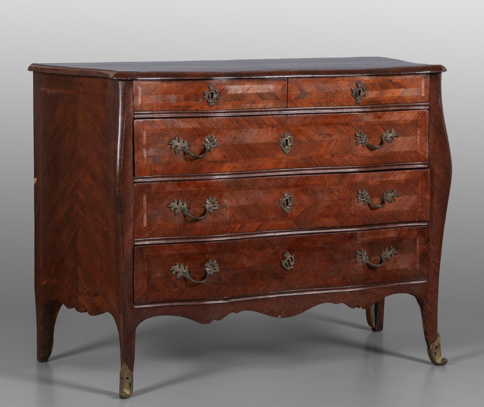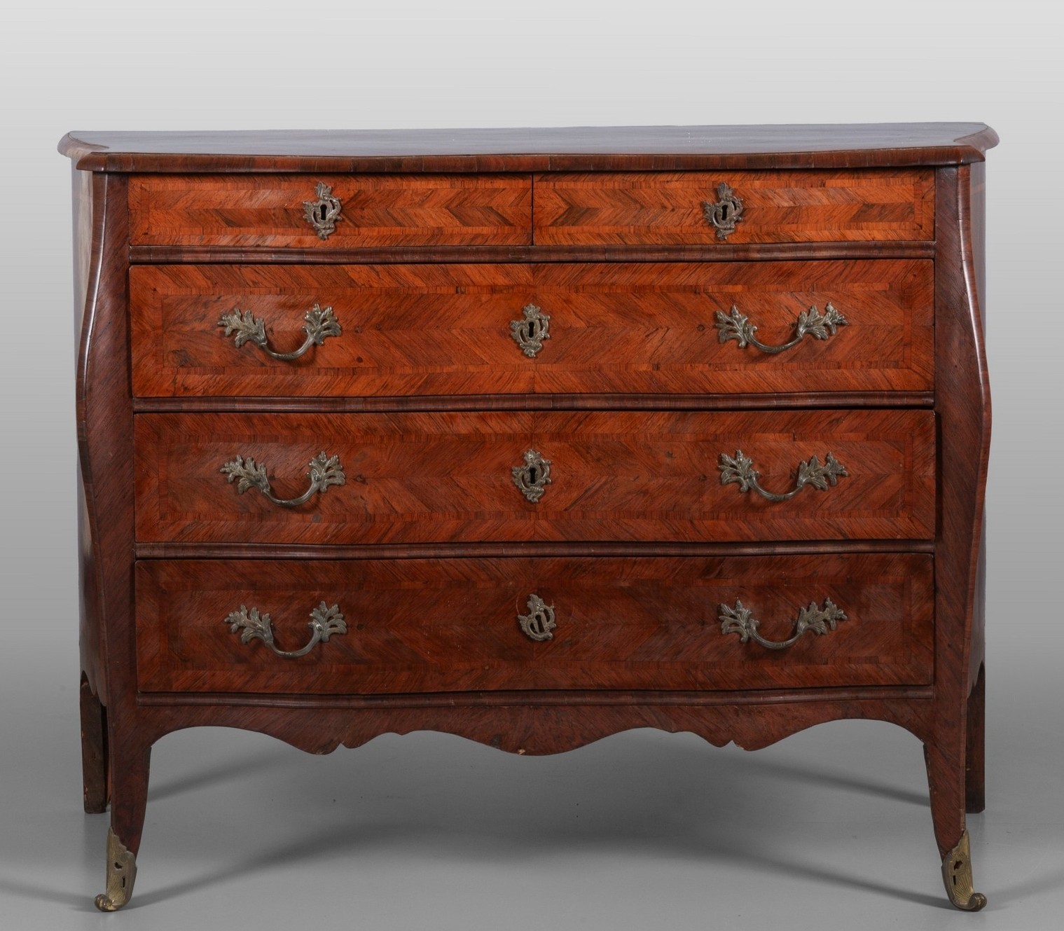 La linea mossa del fronte, l’elegante lastronatura in palissandro a spina di pesce e le raffinate maniglie in bronzo cesellato rendono questo mobile un raro esempio dell’ebanisteria genovese d’inizio Settecento.