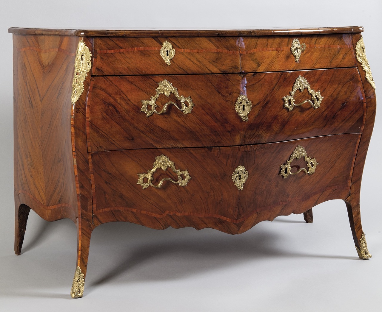 Lastronato in noce d’India e filettato in bois de rose, piano in legno, bronzi dorati al mercurio.