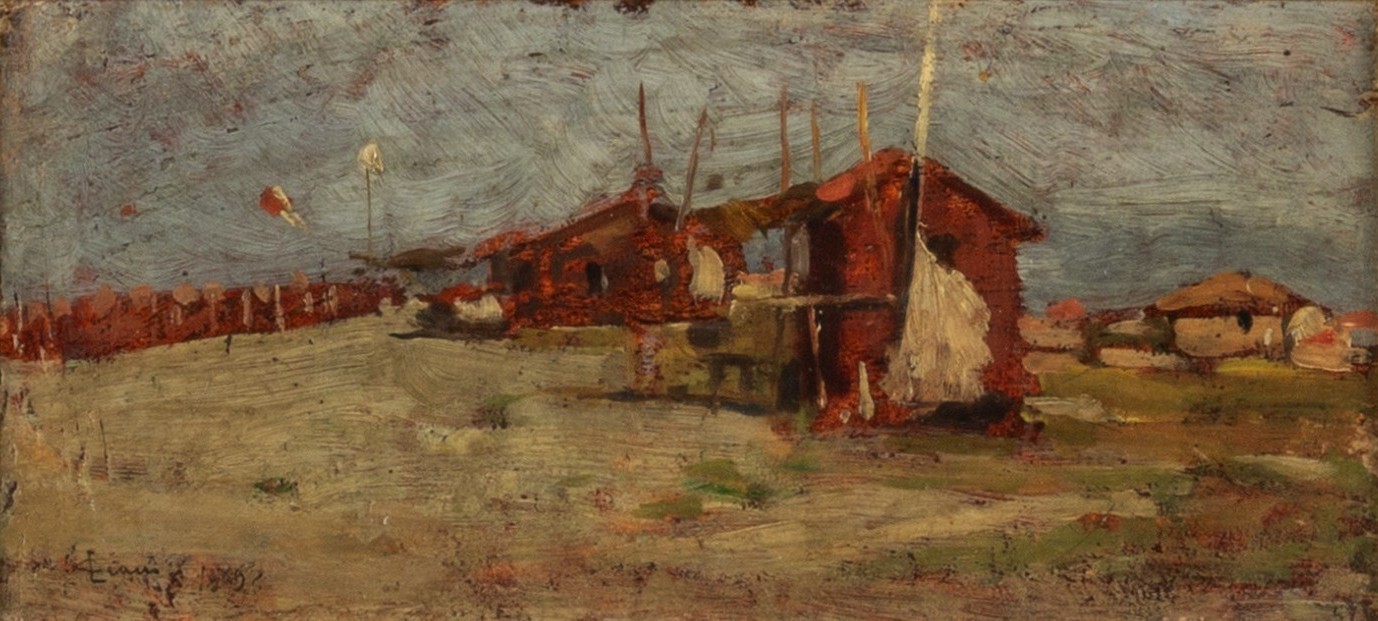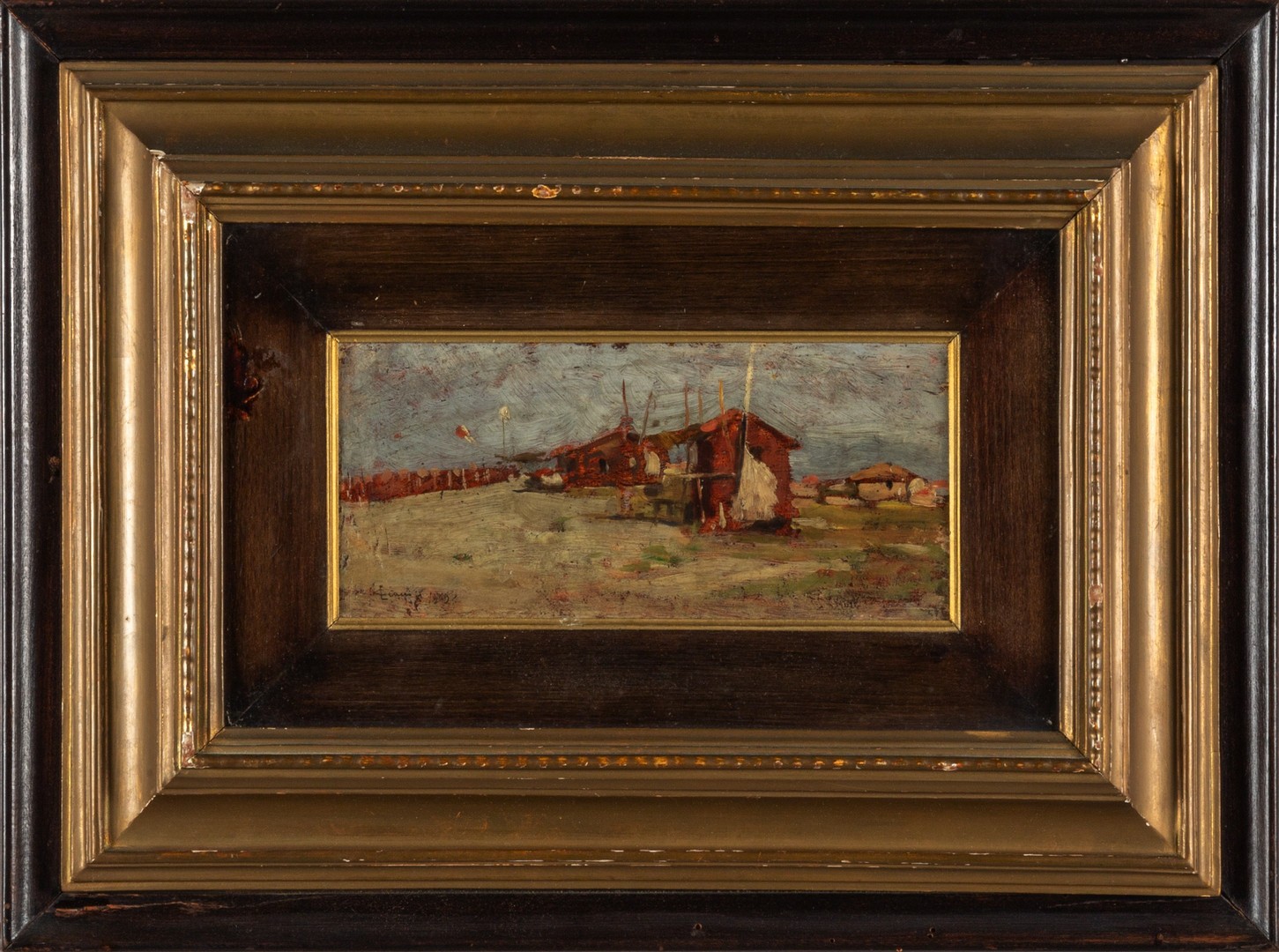 Cesare Ciani (Firenze 1854 1925) Casolari nel vento, olio su tavoletta