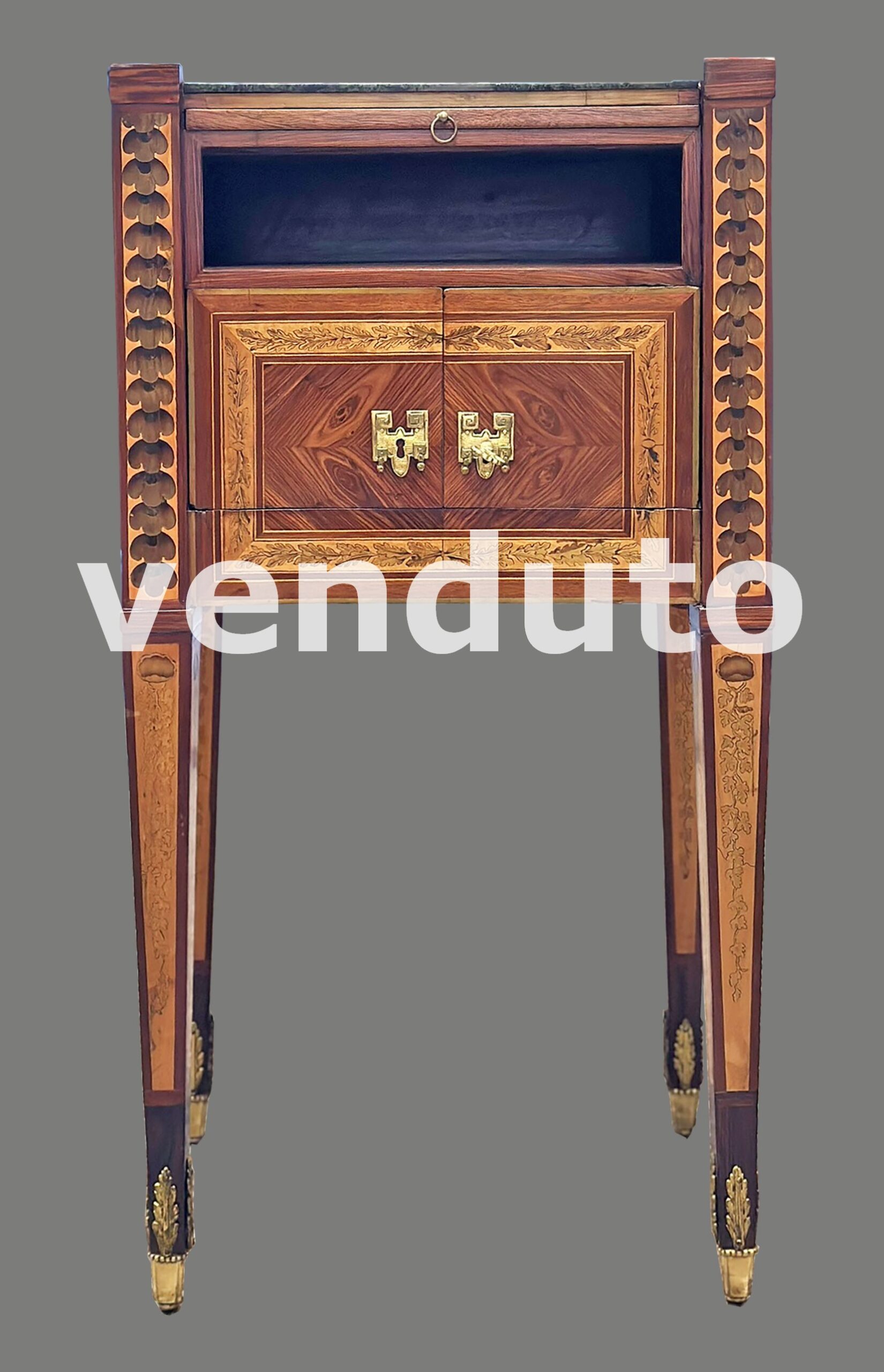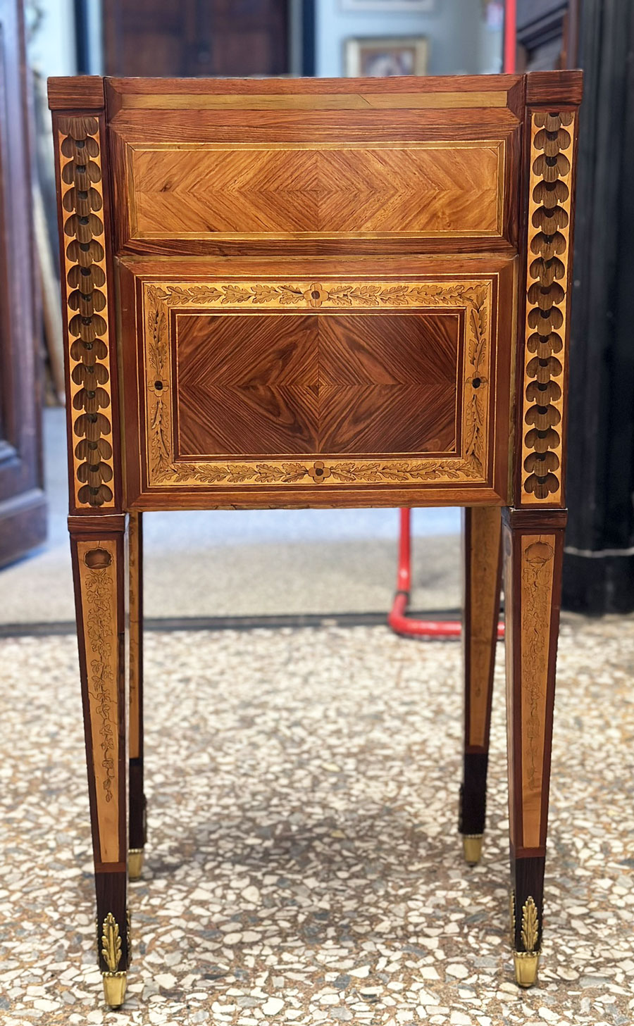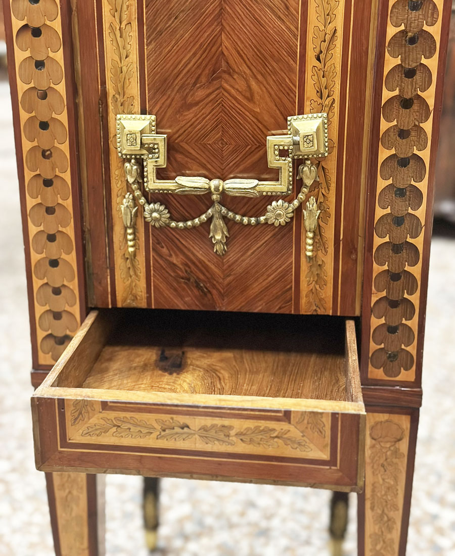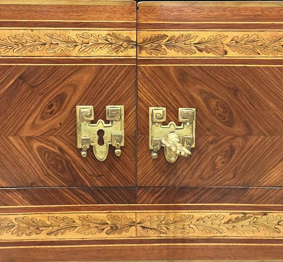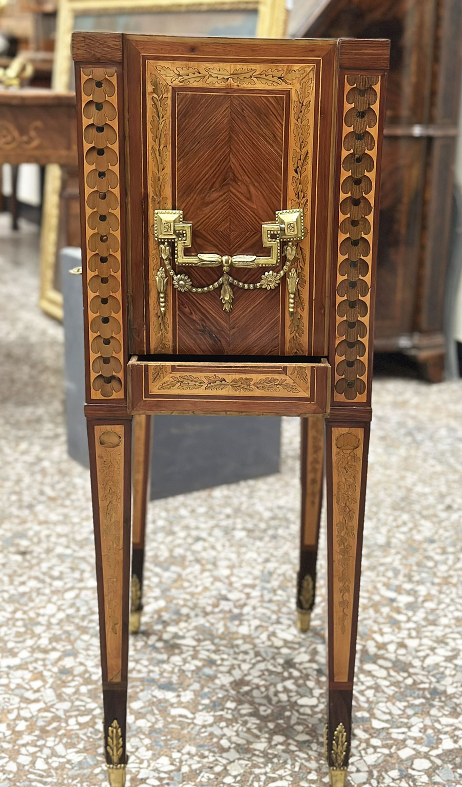 Elegante esempio di ebanisteria genovese di fine Settecento, questo comodino si distingue per la raffinata lastronatura e l’intarsio geometrico e vegetale eseguito con legni pregiati.