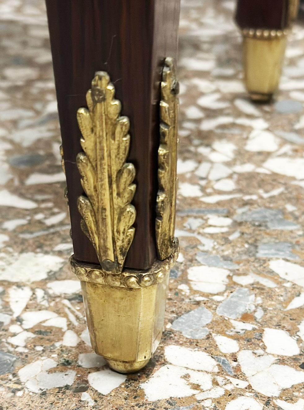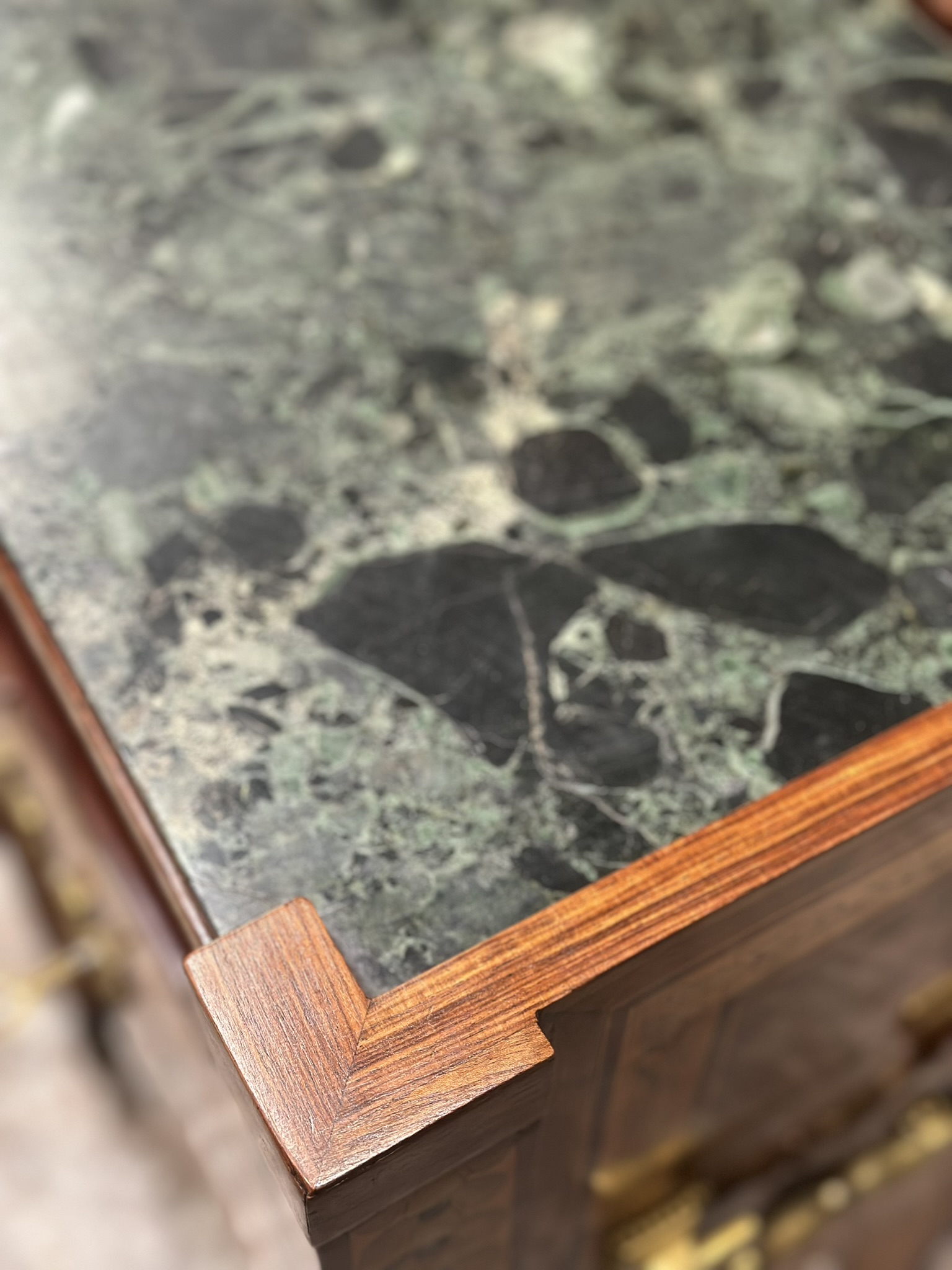 Il piano in marmo verde, originale dell’epoca, è arricchito da una tablette estraibile sottostante, rivestita in pelle, che ne aumenta la funzionalità senza comprometterne l’eleganza. I bronzi cesellati, di modello poco comune, decorano con gusto i piedi e le serrature, completando l’insieme con un tocco nobiliare.