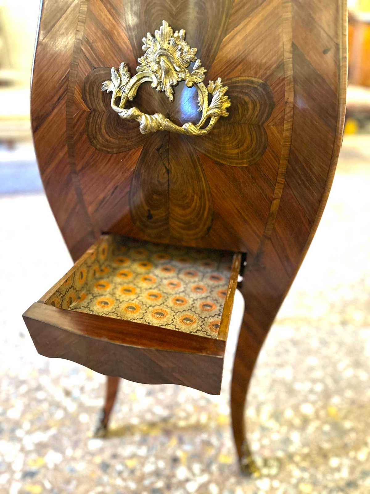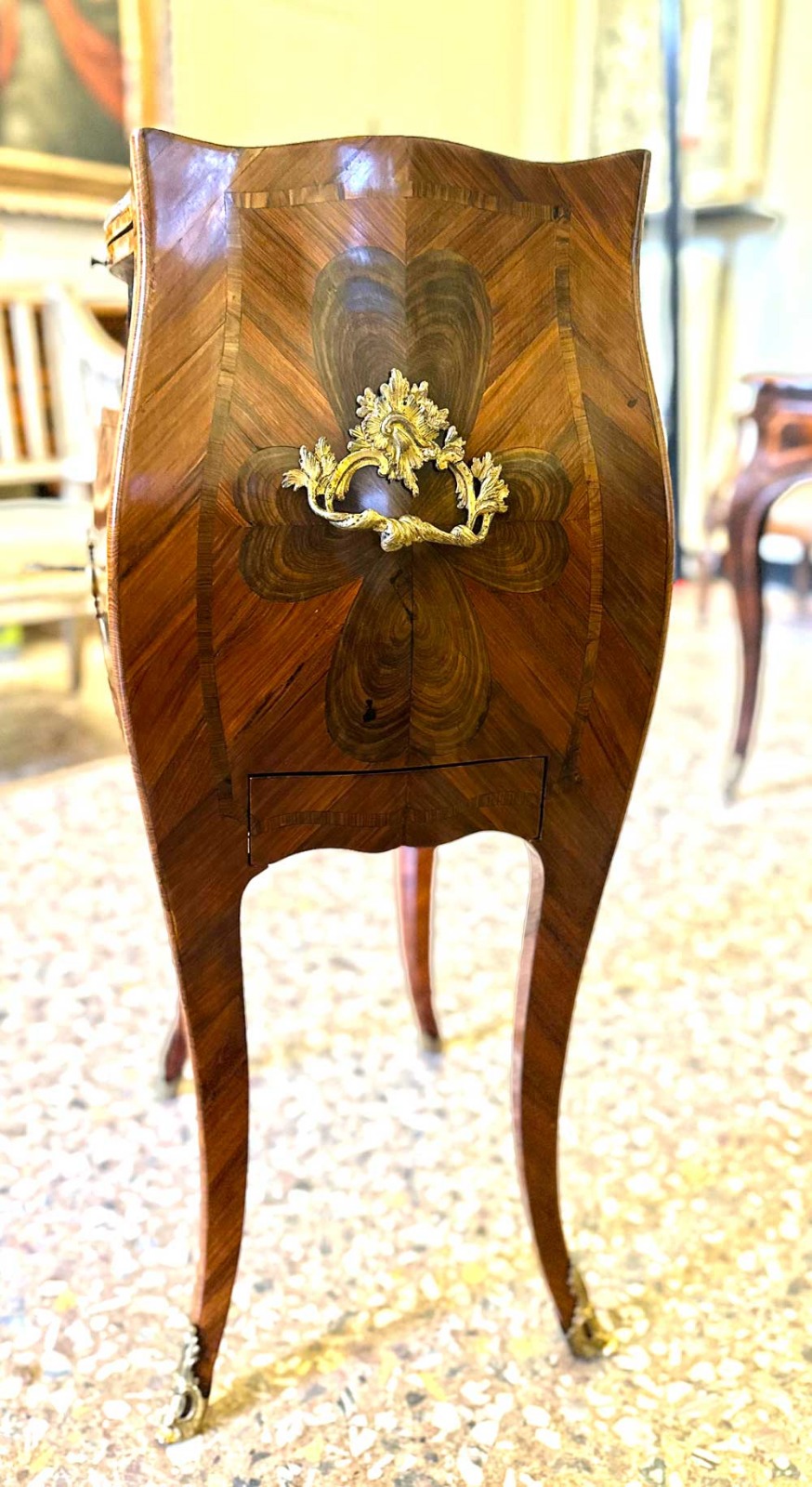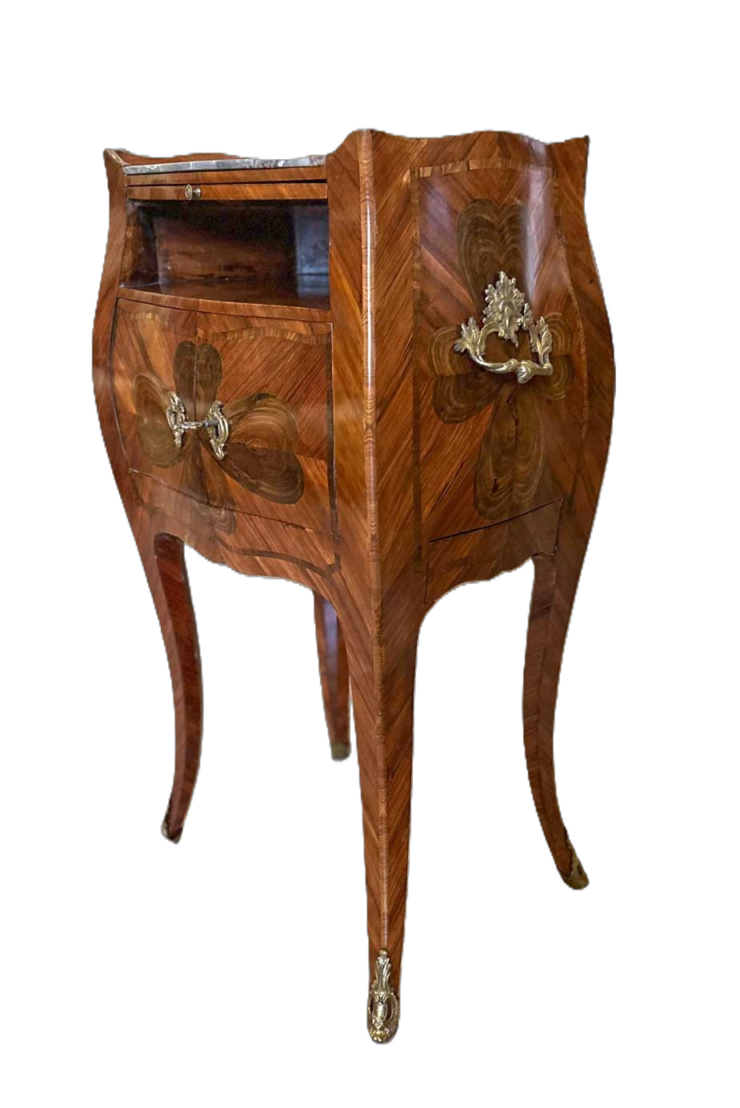 Dotato di vano con sportelli e di un pratico cassettino laterale; sotto al piano è presente una tavoletta estraibile (scrittoio/servizio), utile e discreta. Completa l’insieme il piano in marmo fior di pesco, ben accordato alle tonalità calde delle essenze lignee, e la presenza di maniglie e piedini in bronzo dorato finemente cesellato.