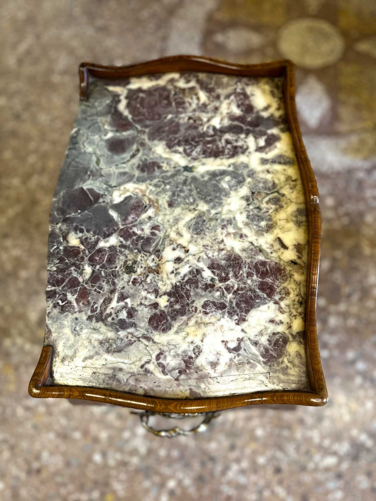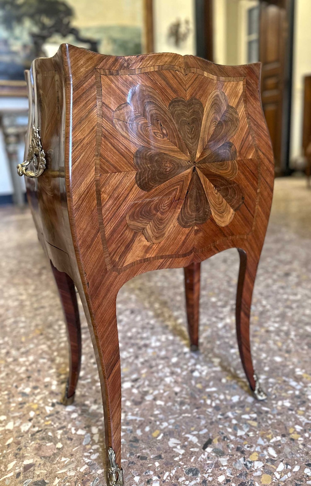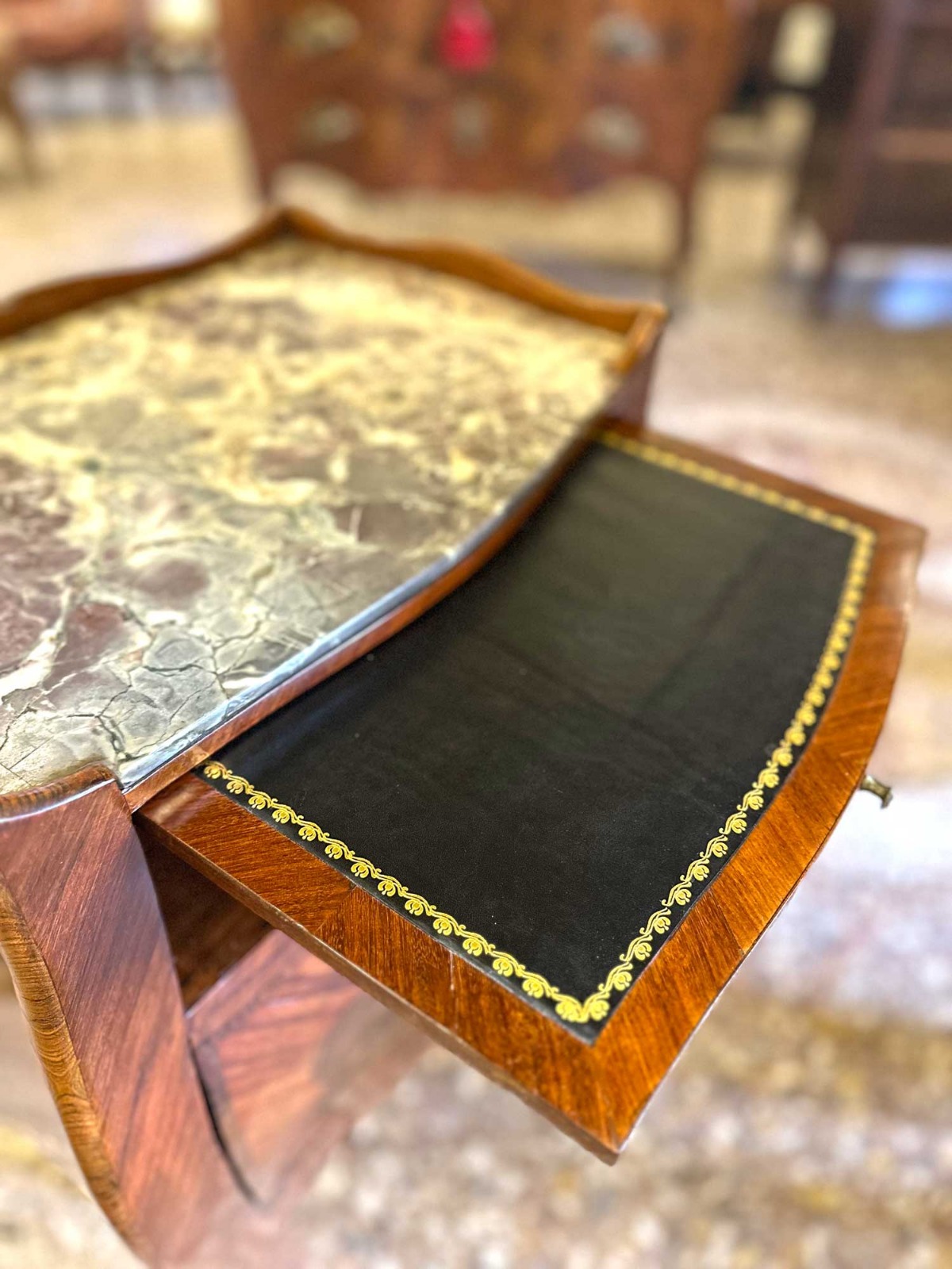 Dotato di vano con sportelli e di un pratico cassettino laterale; sotto al piano è presente una tavoletta estraibile (scrittoio/servizio), utile e discreta. Completa l’insieme il piano in marmo fior di pesco, ben accordato alle tonalità calde delle essenze lignee, e la presenza di maniglie e piedini in bronzo dorato finemente cesellato.