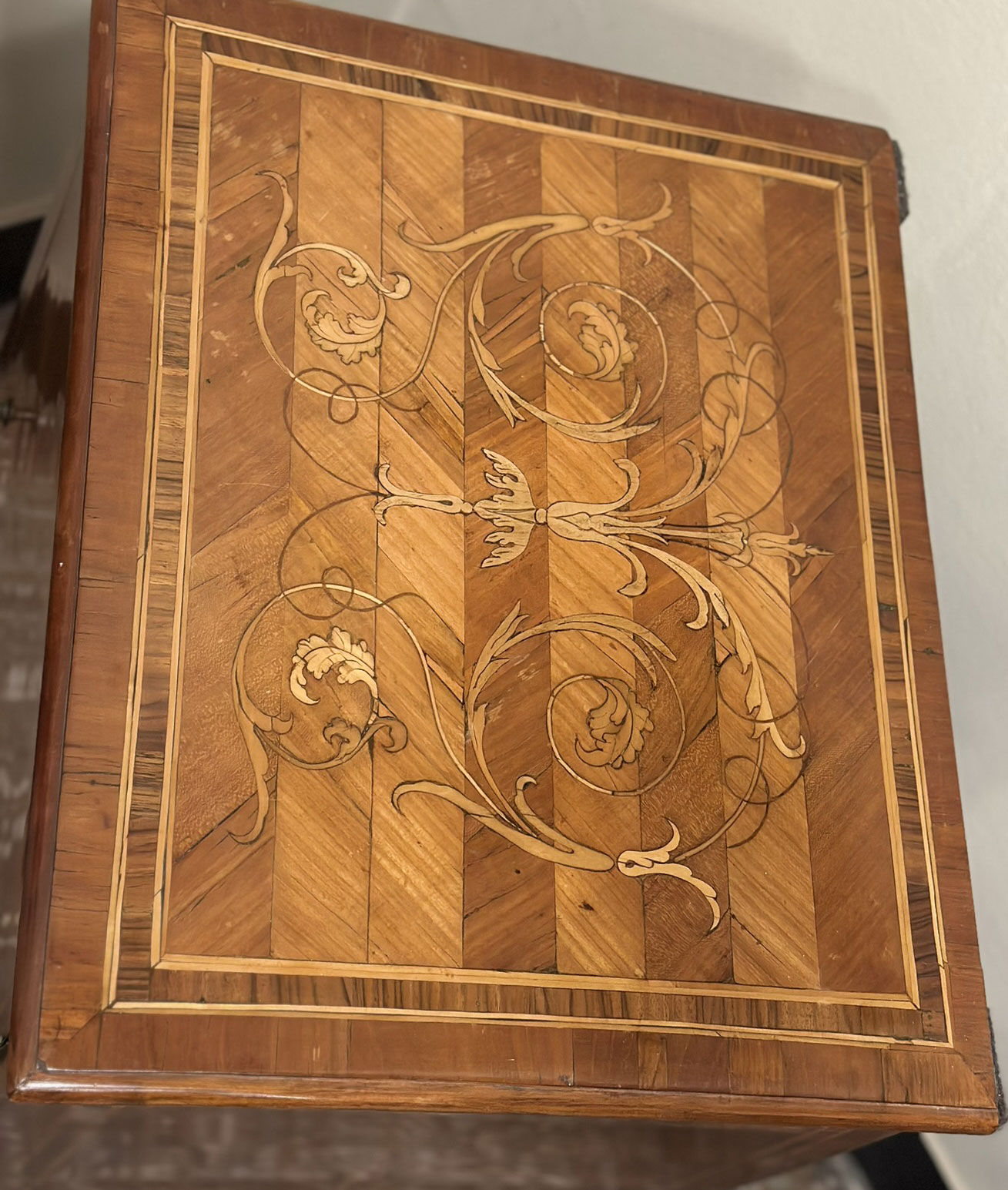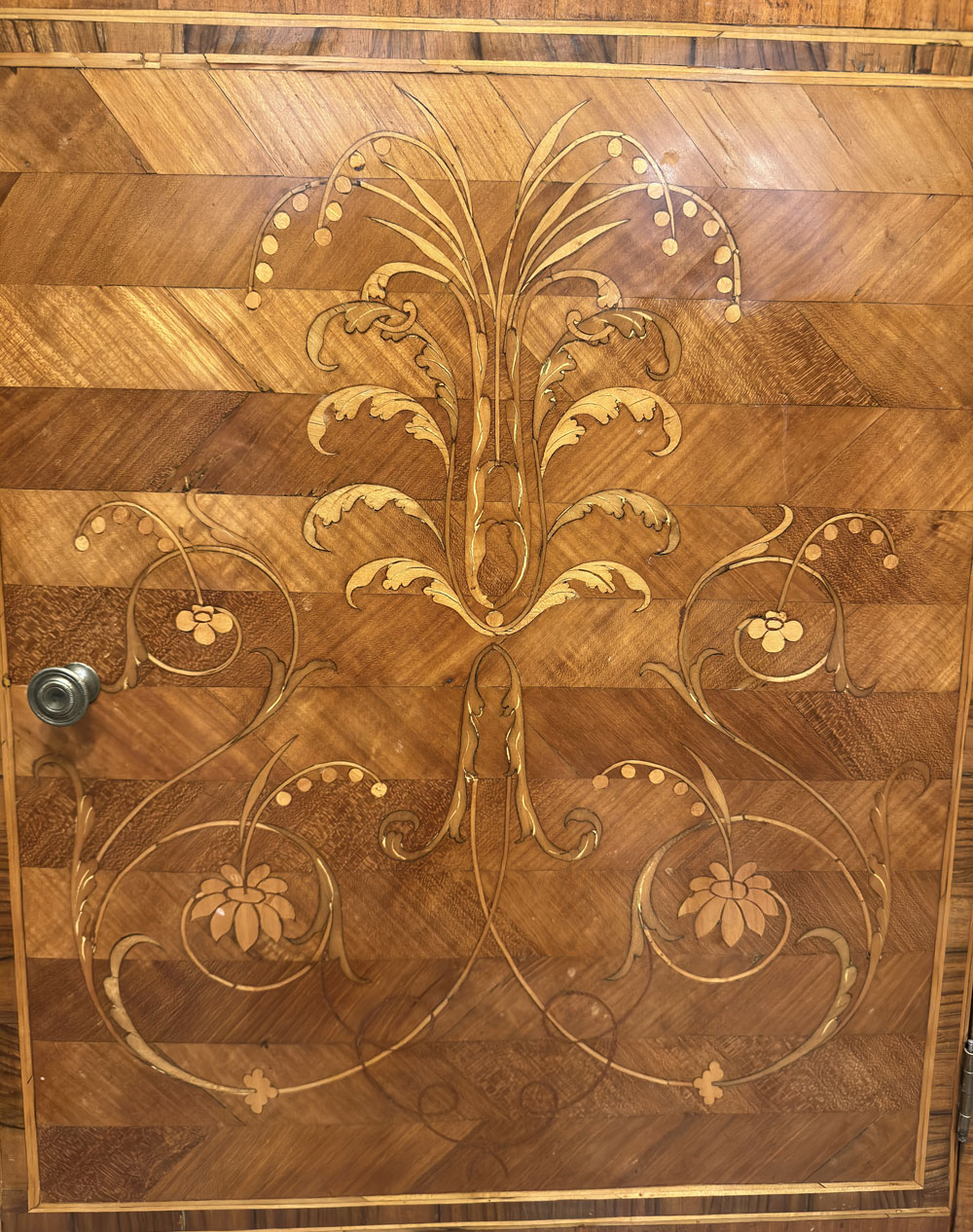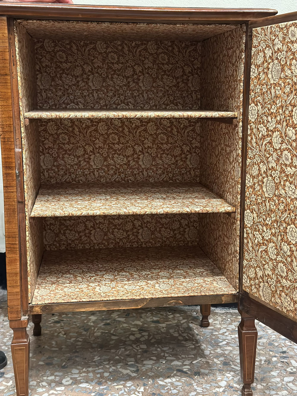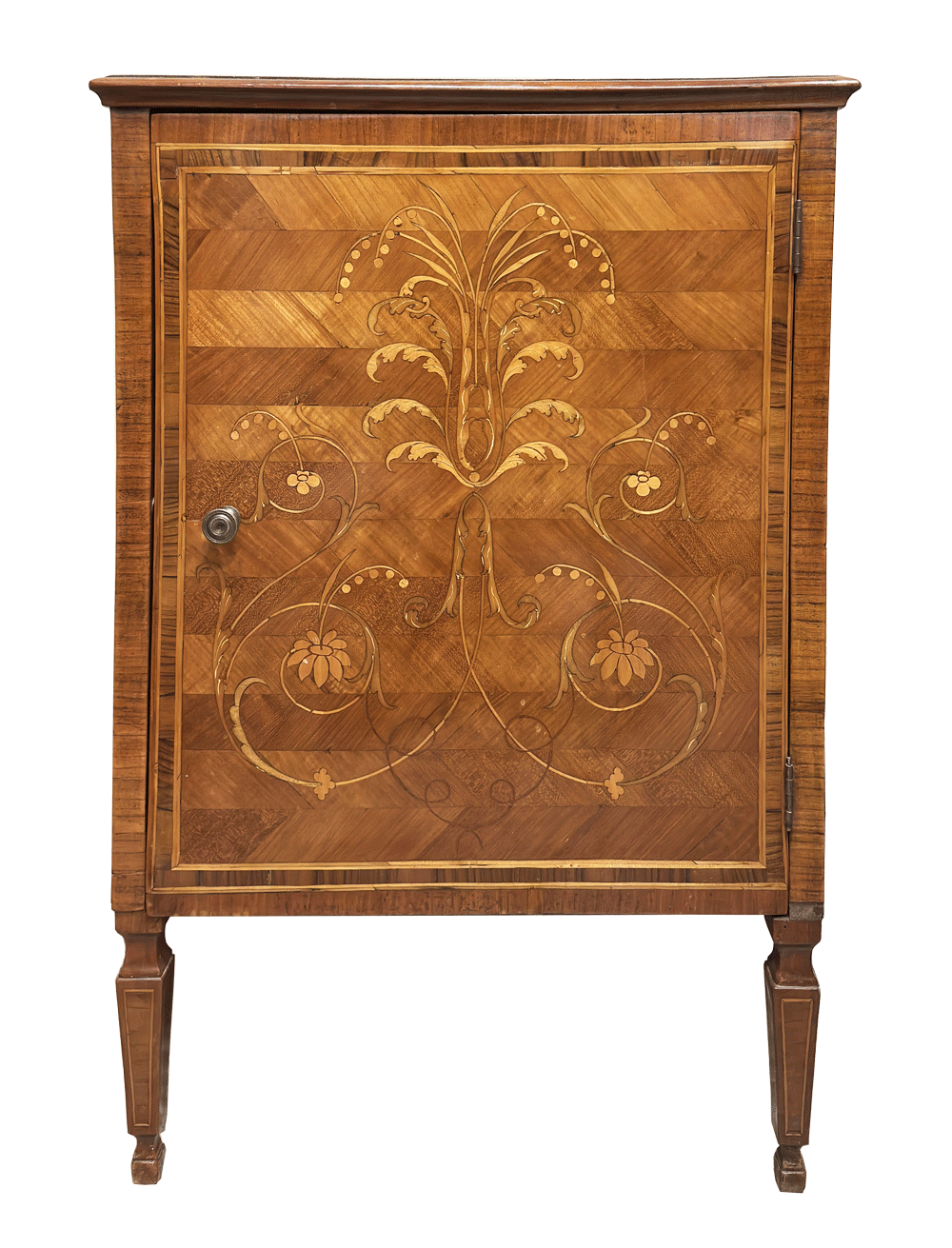 Raffinato comoncino a sportello singolo, realizzato in Lombardia alla fine del Settecento. Lastronato in ciliegio e decorato con una preziosa intarsia a motivi vegetali, mostra la tipica eleganza del gusto Luigi XVI. La struttura slanciata poggia su gambe troncopiramidali scanalate, mentre l’interno, rivestito in carta floreale d’epoca, è suddiviso da due ripiani.