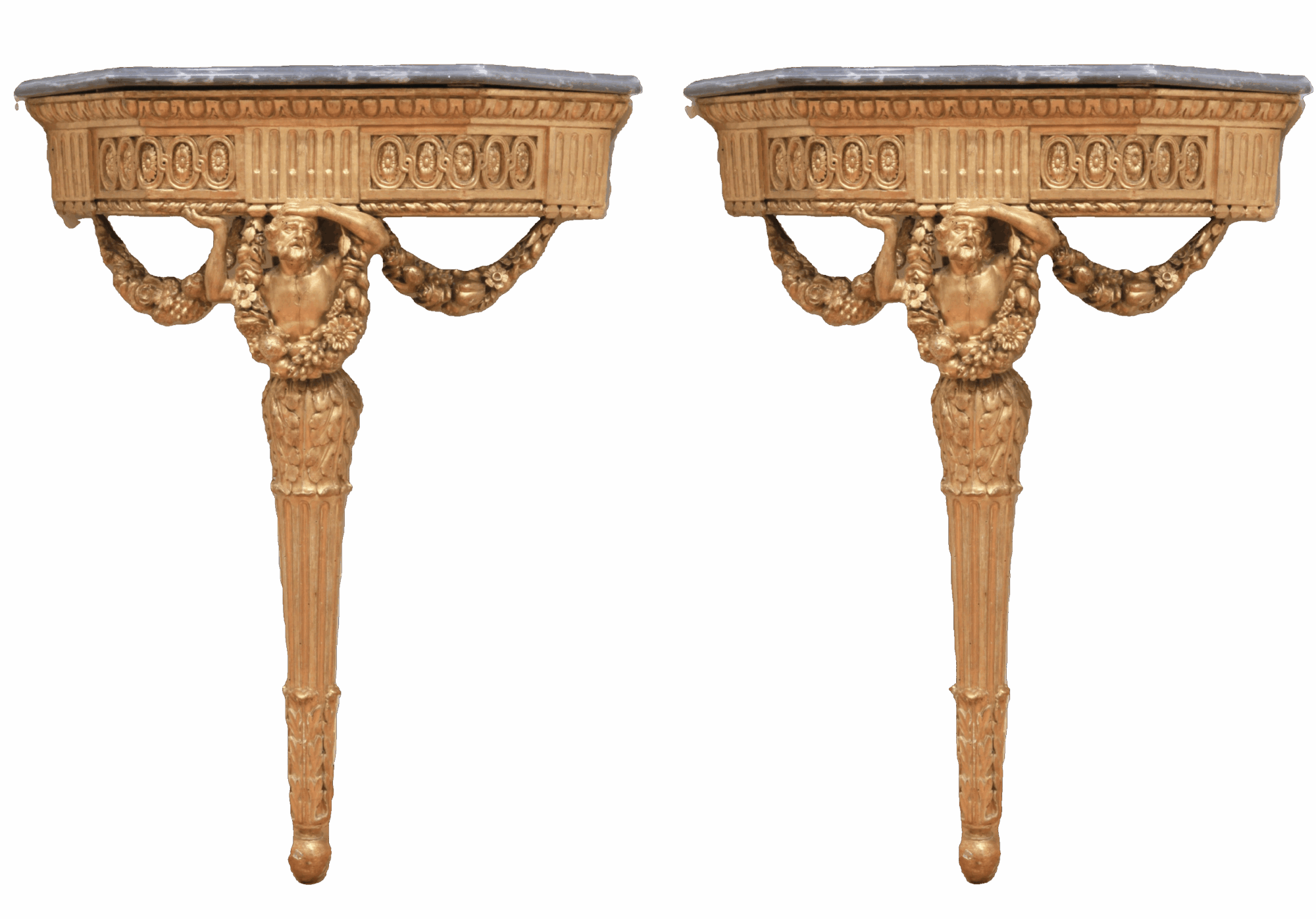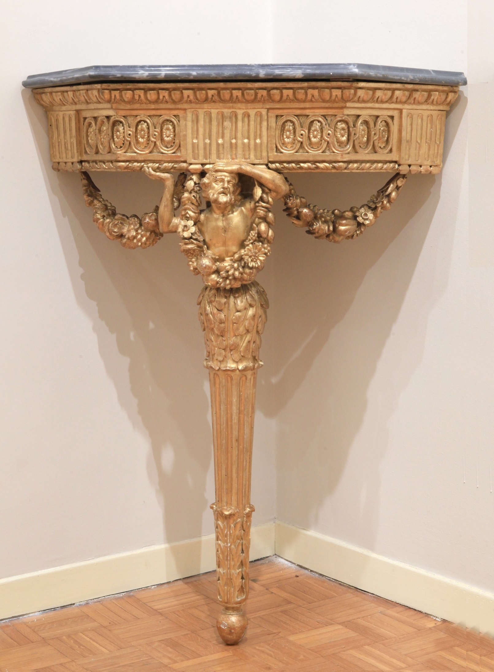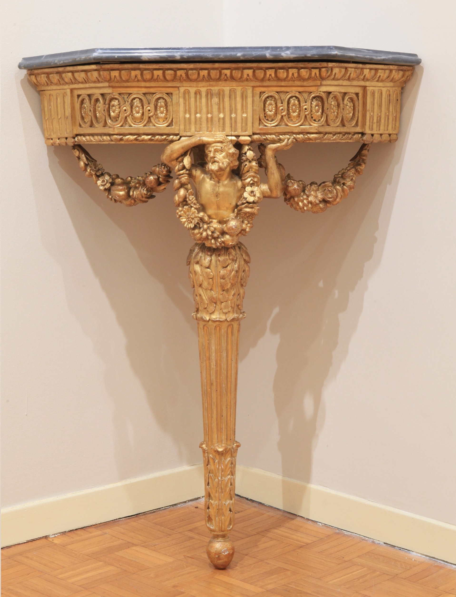 Le gambe, rastremate e scanalate, sono riunite al centro da una crociera intagliata, elemento sia strutturale che decorativo, che dona equilibrio e verticalità al mobile. Il piano in marmo bardiglio grigio-bluastro, sagomato a seguire l’angolo, si armonizza perfettamente con la doratura calda del legno, creando un elegante contrasto materico e cromatico.