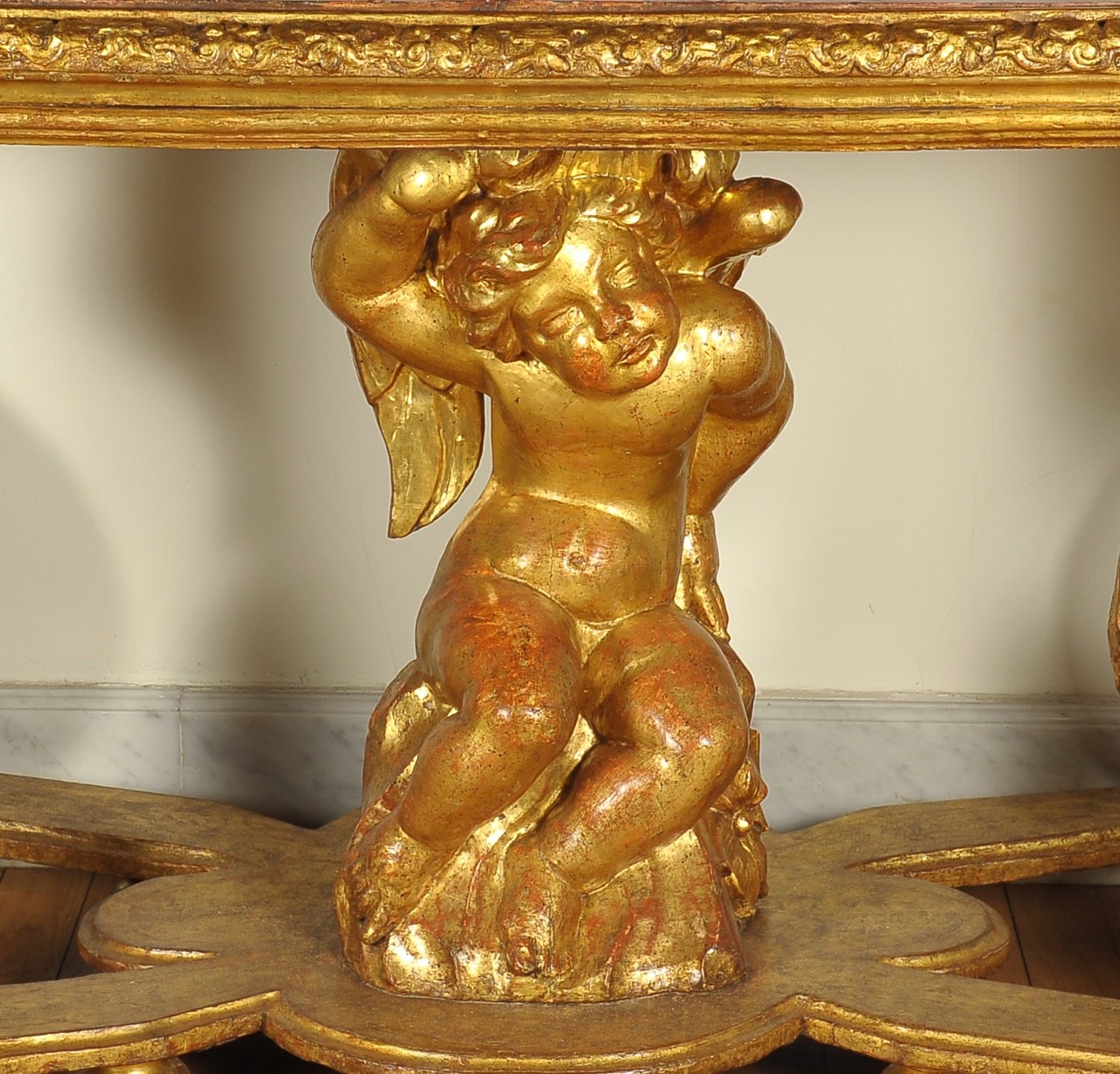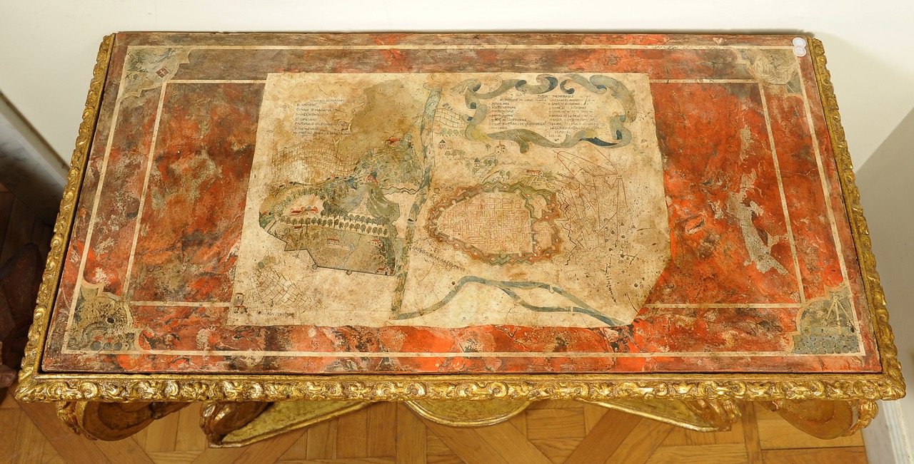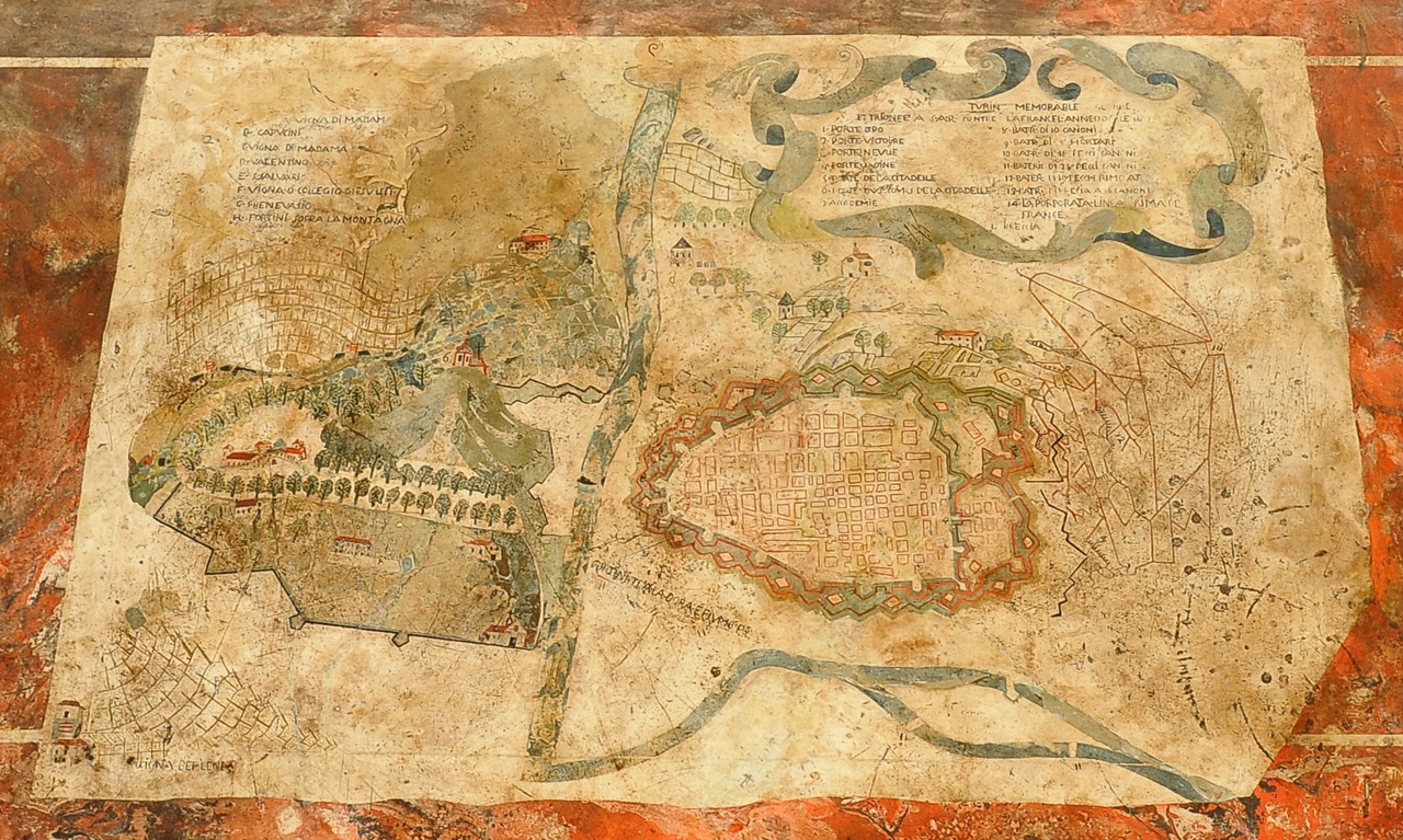 La crociera sormontata da putto alato; il piano in scagliola raffigura “Pianta della città di Torino durante l’assedio del 1707”; è corredata da didascalie sulle postazioni militari ed attribuita al pittore Lorenzo Bononcelli, artista al servizio di Vittorio Amedeo di Savoia