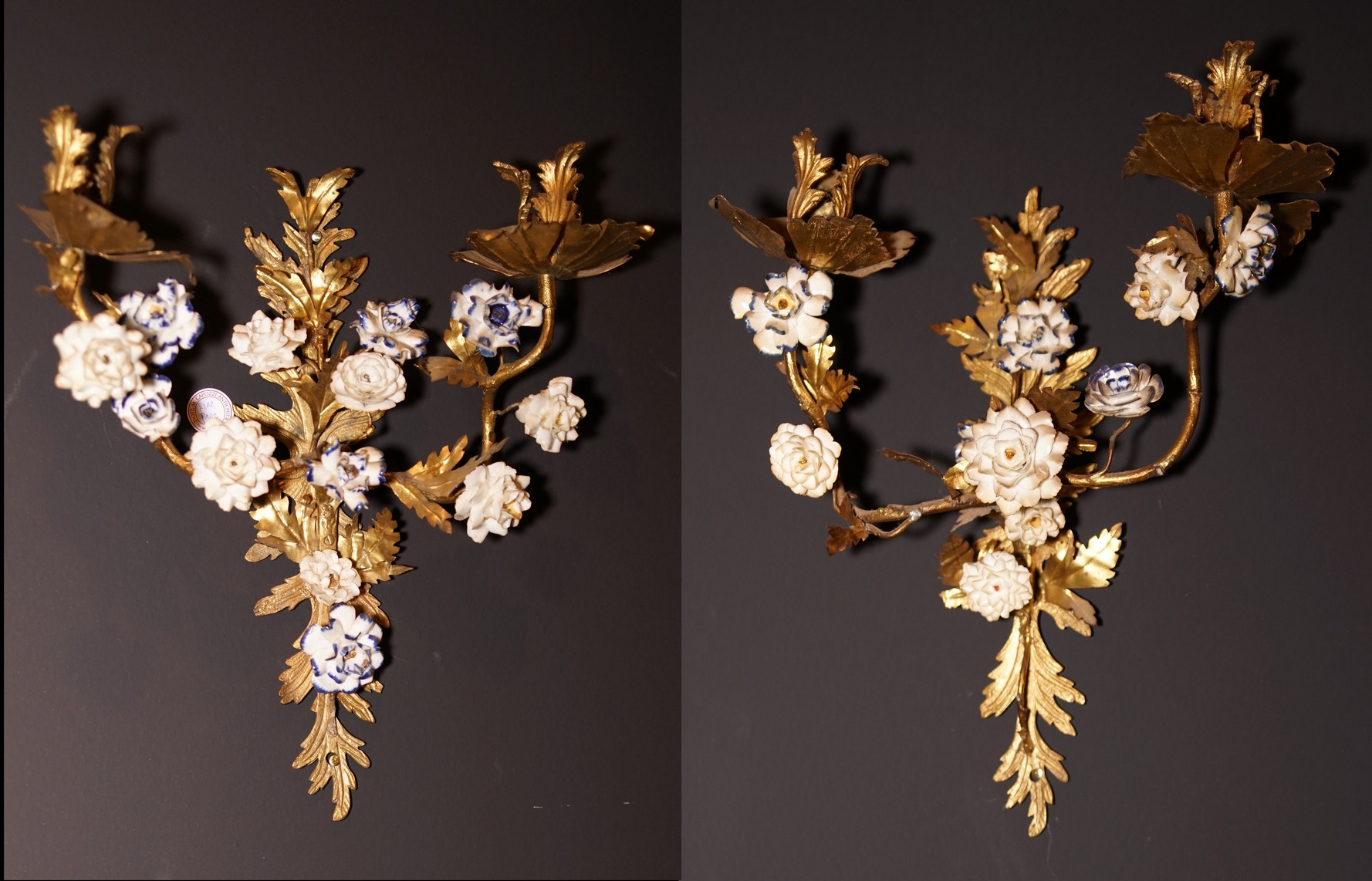 Coppia di applique a due luci in tolla con applicazioni di fiori in porcellana policromata, Francia fine secolo XVIII