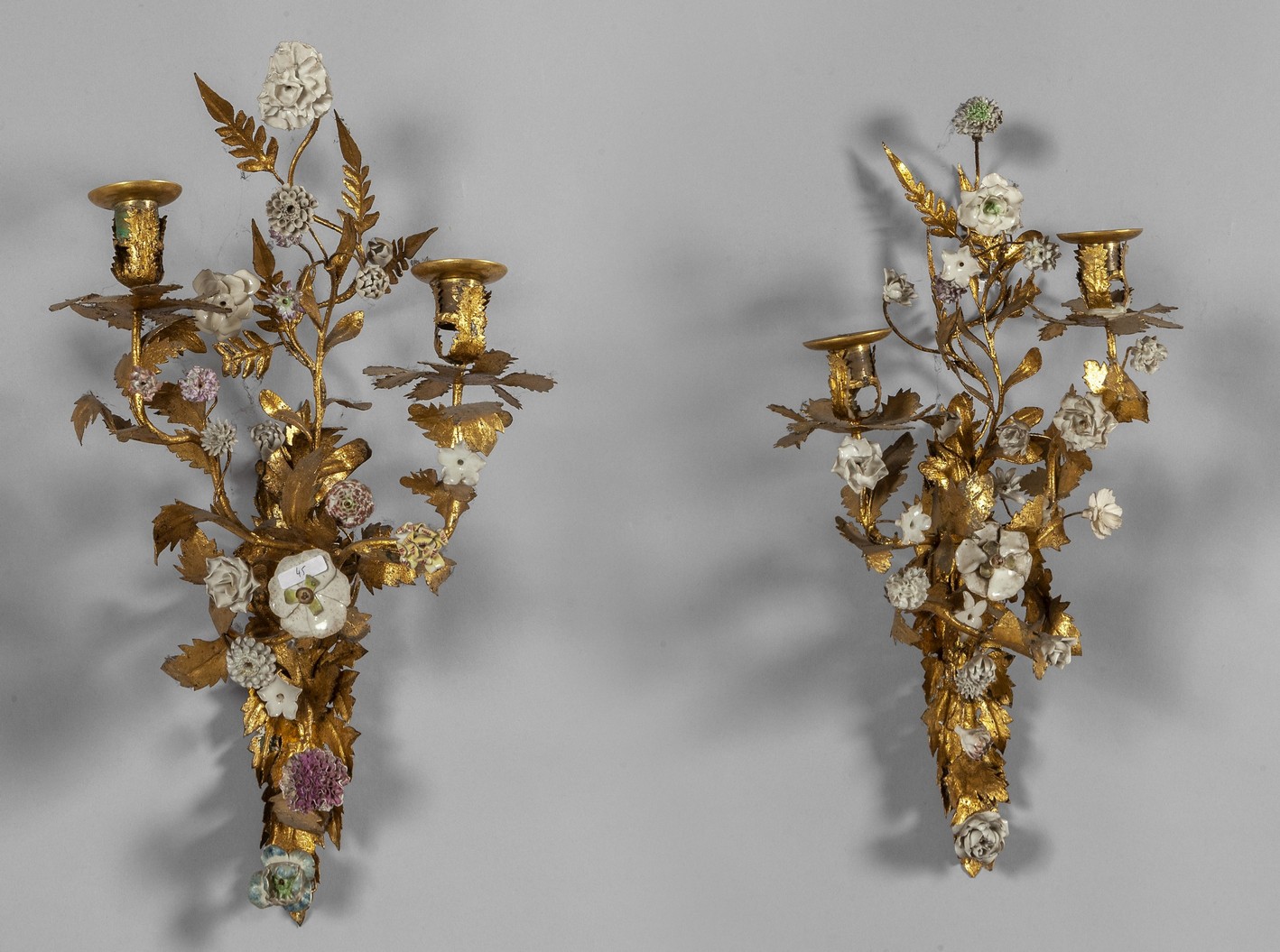 Coppia di applique ad angolo a due luci in ferro dorato, secolo XIX