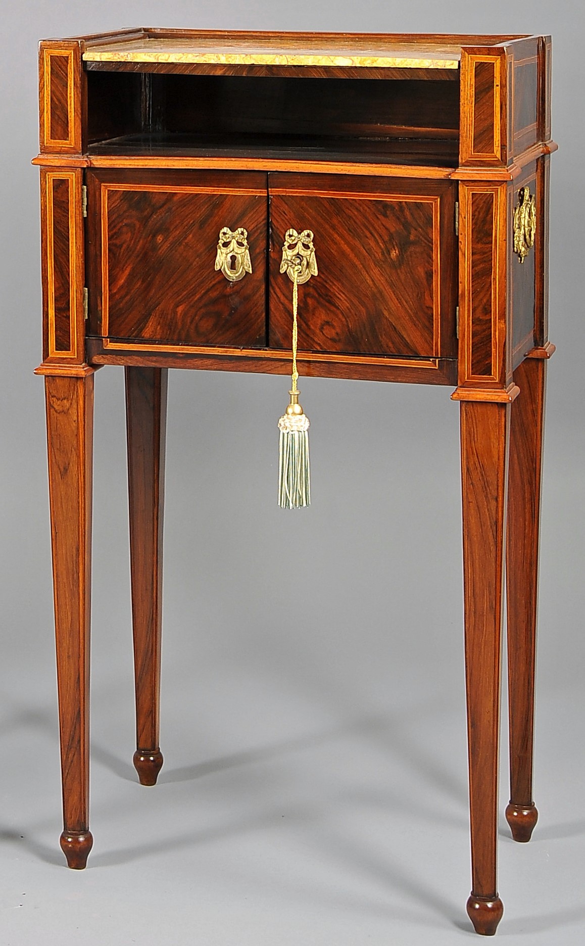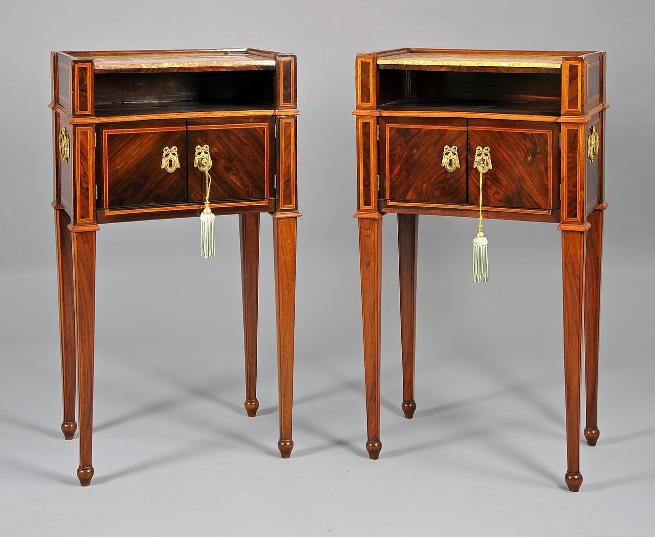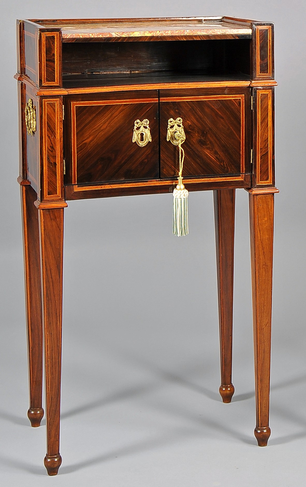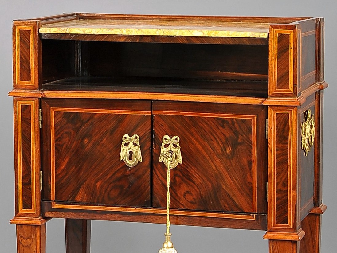 A due sportelli lastronati in palissandro, filettati in bosso e legno di rosa; piani in marmo broccatello, Genova ultimo quarto XVIII secolo