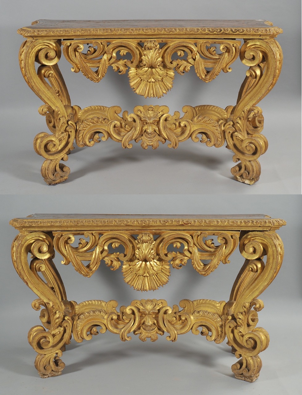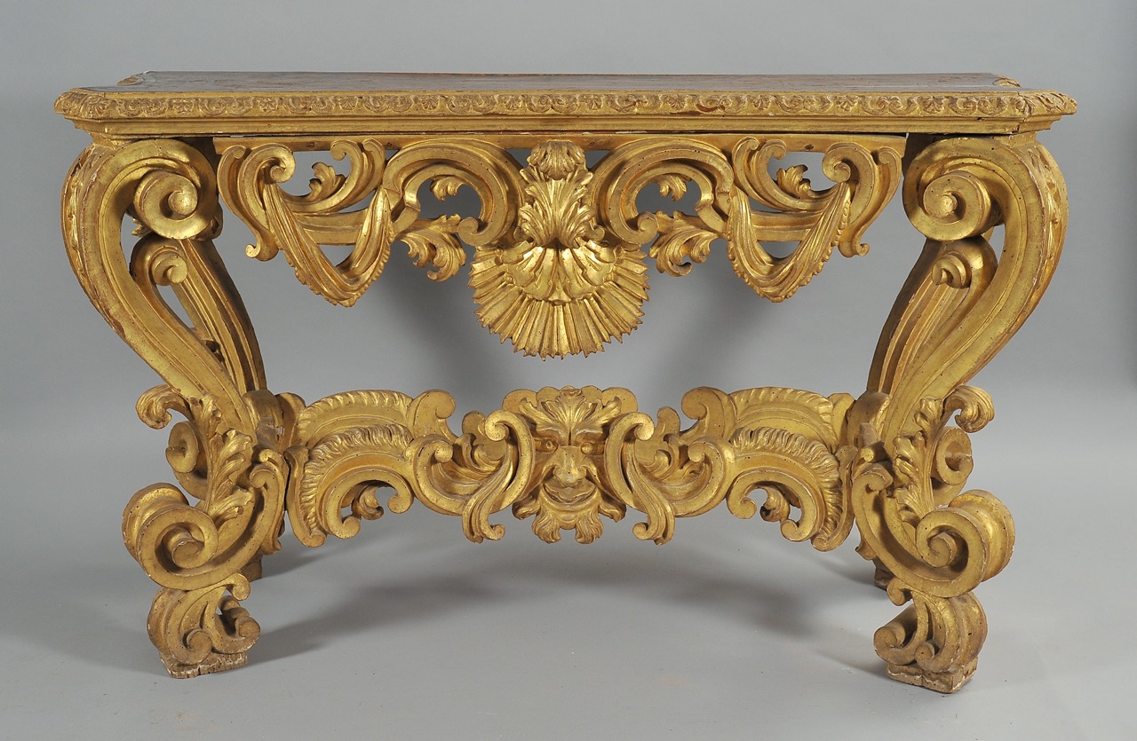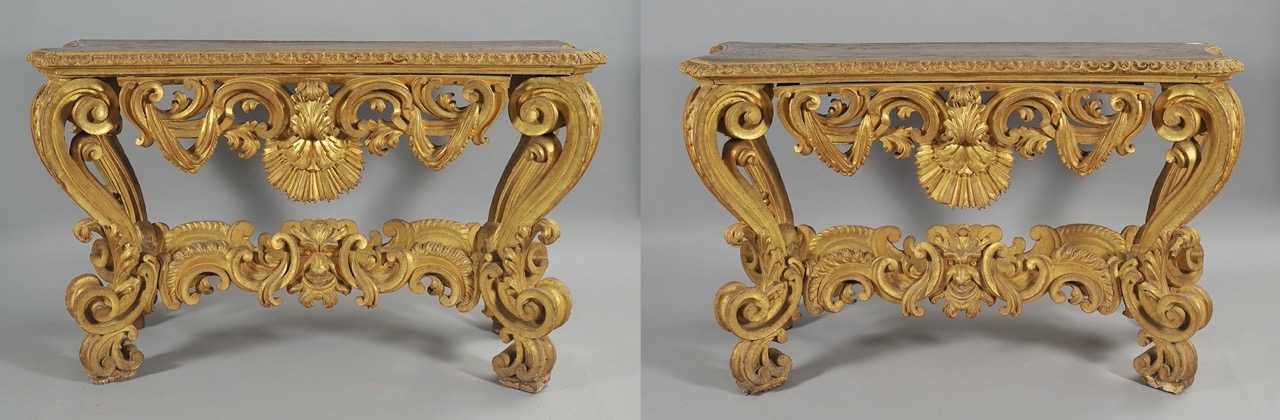 Eccezionale coppia di consolle Luigi XIV in legno intagliato e dorato, Bologna ultimo quarto secolo XVII