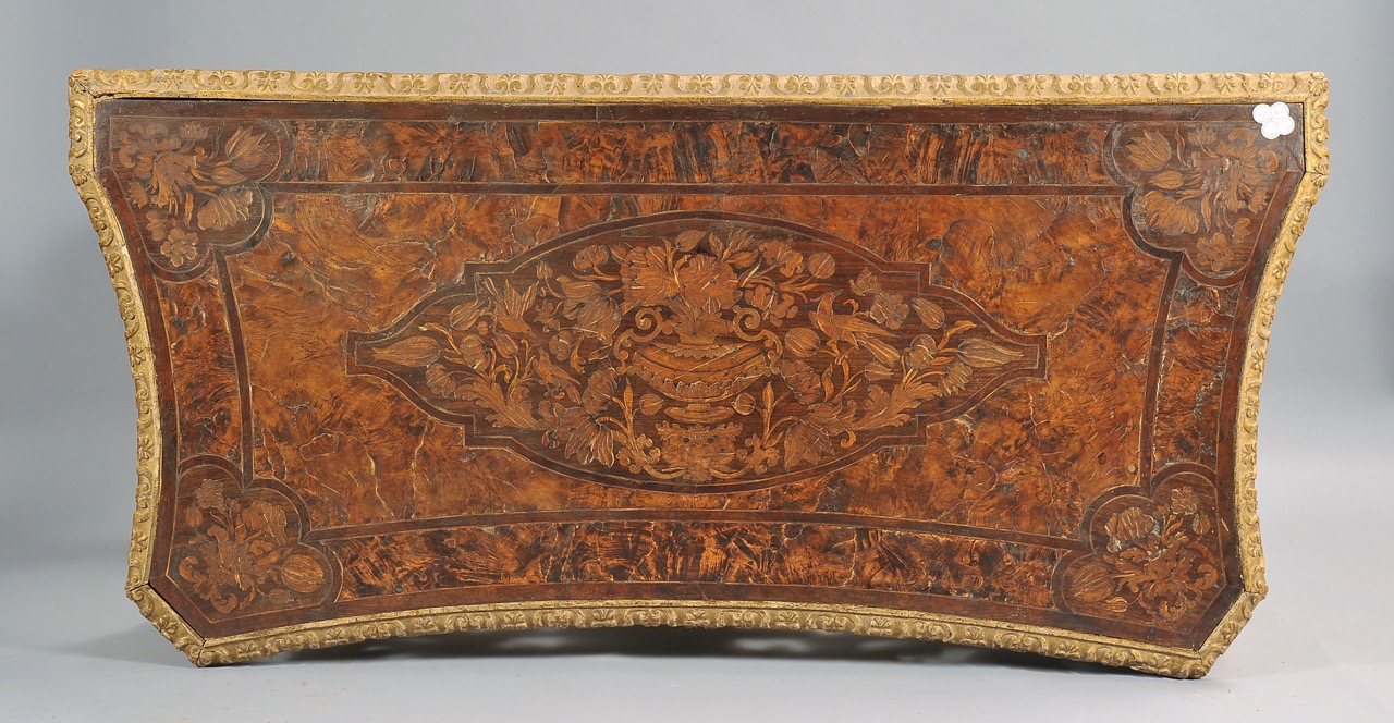 Piani in legno impiallacciato di ebano e intarsiato in legni vari con decoro a vasi di fiori e ghirlande. Botteghe Grimaldi o Richard Le Brun (Riccardo Bruni).